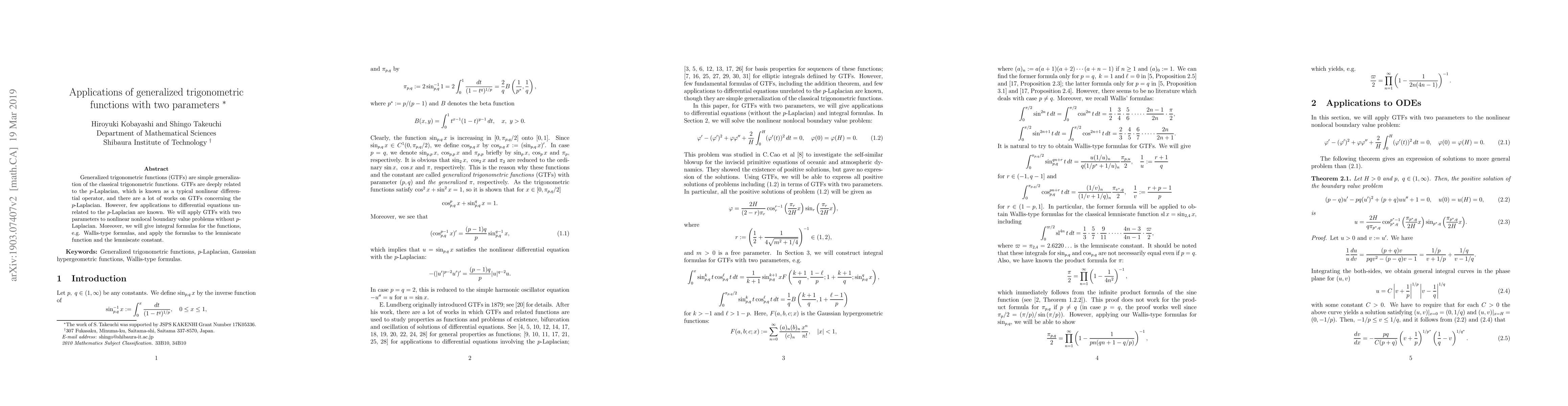 Generalized trigonometric functions (GTFs) are simple generalization of the classical trigonometric functions. GTFs are deeply related to the $p$-Laplacian, which is known as a typical nonlinear differential operator, and there are a lot of works on GTFs concerning the $p$-Laplacian. However, few applications to differential equations unrelated to the $p$-Laplacian are known. We will apply GTFs with two parameters to nonlinear nonlocal boundary value problems without $p$-Laplacian. Moreover, we will give integral formulas for the functions, e.g. Wallis-type formulas, and apply the formulas to the lemniscate function and the lemniscate constant.