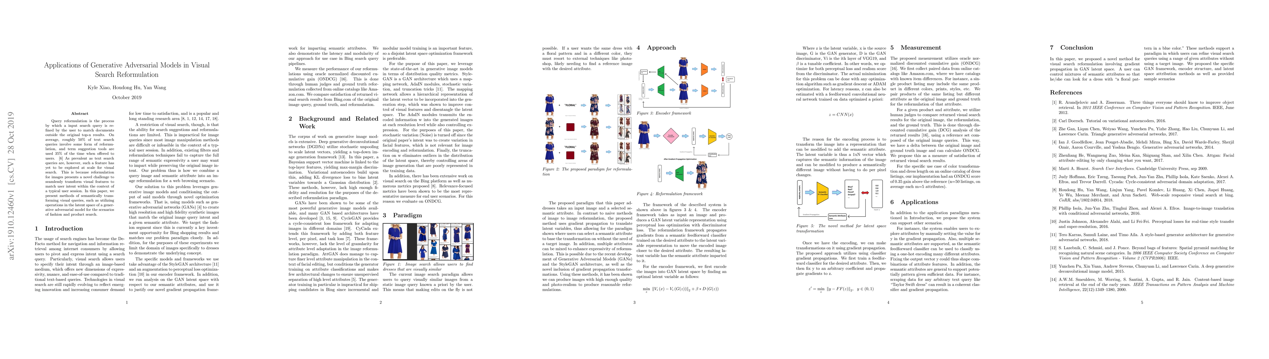 This paper explores the application of generative adversarial models (GANs) for query reformulation in visual search, particularly in fashion and product domains. It proposes methods to semantically transform visual queries in latent space to match user intent, addressing the challenge of adapting visual features for effective reformulation.