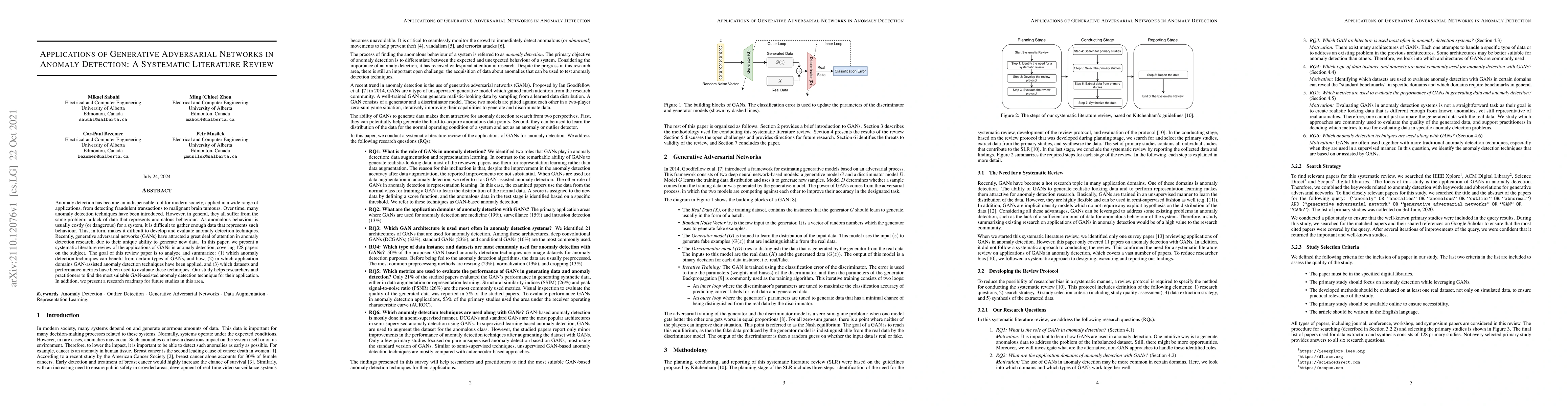 This paper presents a systematic literature review of 128 studies on the applications of Generative Adversarial Networks (GANs) in anomaly detection, analyzing techniques, domains, datasets, and performance metrics.