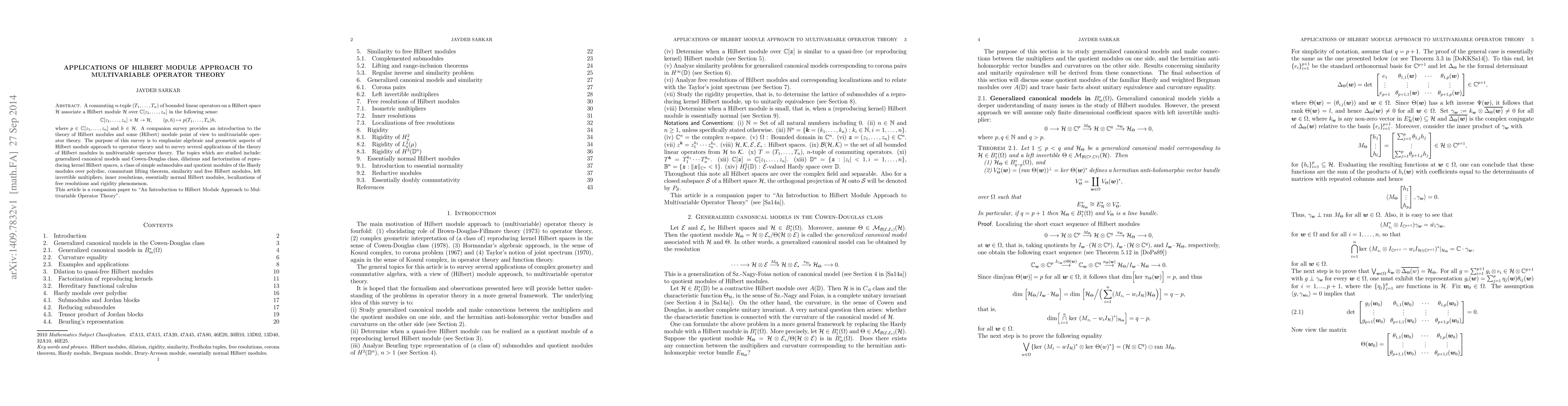This paper surveys the applications of Hilbert module theory to multivariable operator theory, emphasizing algebraic and geometric aspects. It covers topics such as generalized canonical models, dilations, and the study of submodules and quotient modules of Hardy modules, among others.