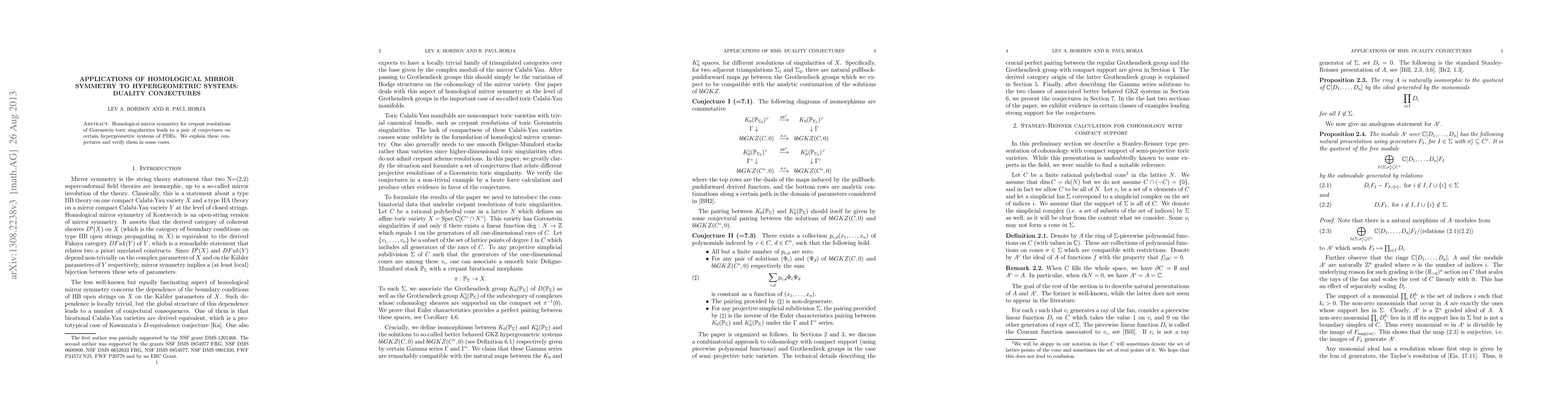 Summary: This paper explores homological mirror symmetry in relation to crepant resolutions of Gorenstein toric singularities, proposing and verifying conjectures about dual hypergeometric systems of PDEs. The findings provide insights into the underlying structure of these systems.
