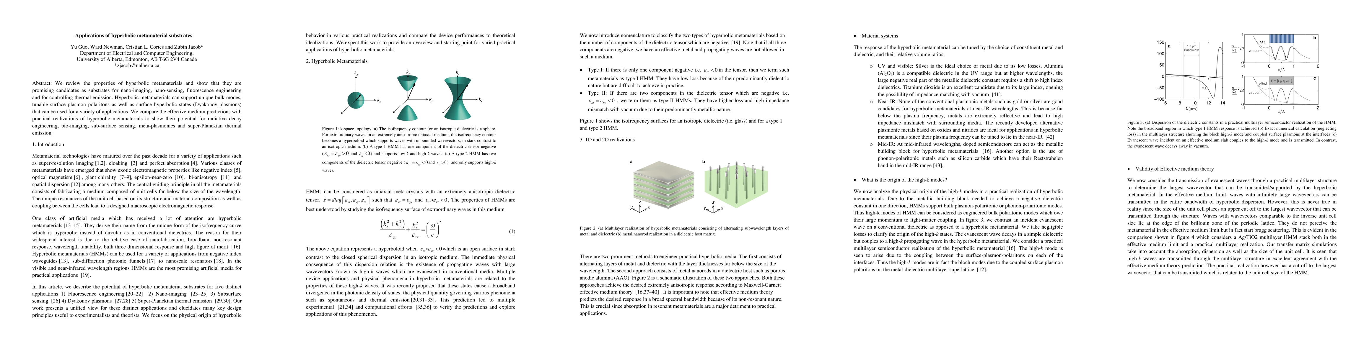 We review the properties of hyperbolic metamaterials and show that they are promising candidates as substrates for nano-imaging, nano-sensing, fluorescence engineering and for controlling thermal emission. Hyperbolic metamaterials can support unique bulk modes, tunable surface plasmon polaritons as well as surface hyperbolic states (Dyakonov plasmons) that can be used for a variety of applications. We compare the effective medium predictions with practical realizations of hyperbolic metamaterials to show their potential for radiative decay engineering, bio-imaging, sub-surface sensing, meta-plasmonics and super-Planckian thermal emission.