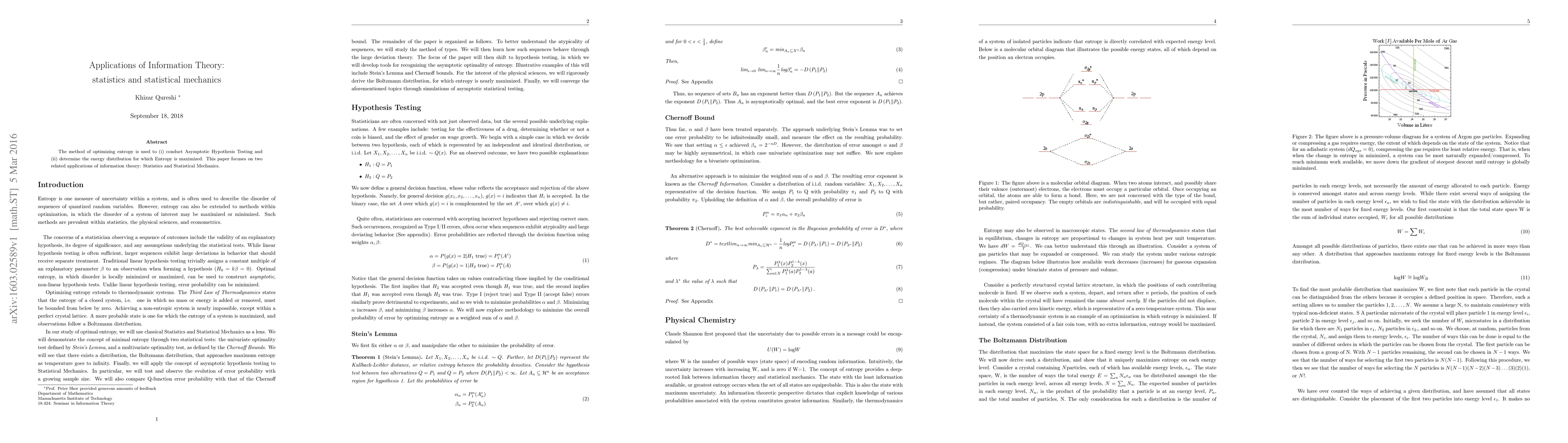 The method of optimizing entropy is used to (i) conduct Asymptotic Hypothesis Testing and (ii) determine the particle distribution for which Entropy is maximized. This paper focuses on two related applications of Information Theory: Statistics and Statistical Mechanics.