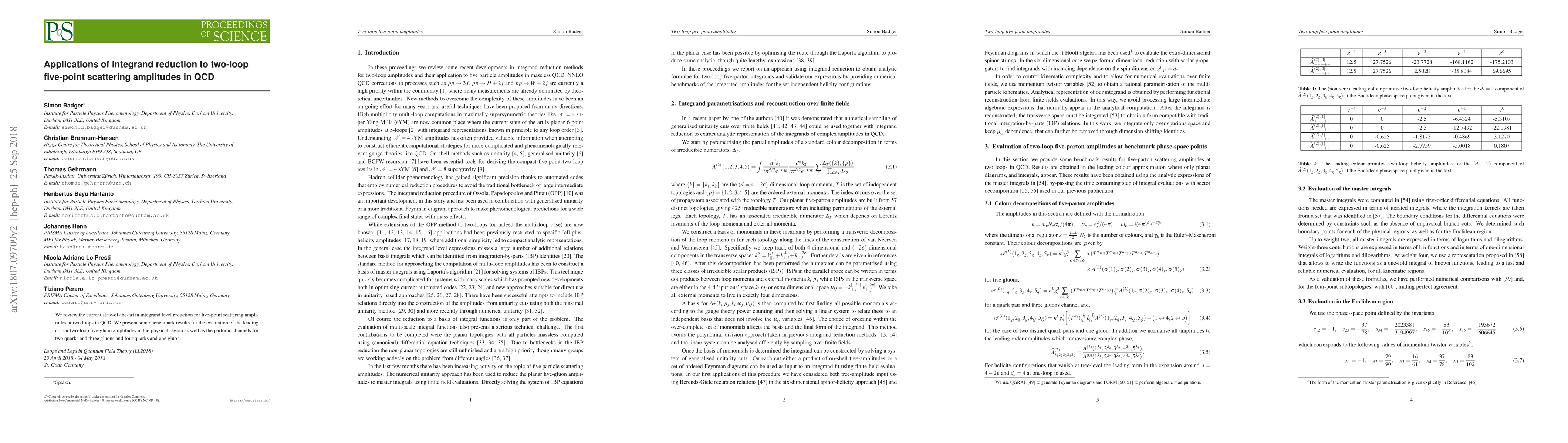 We review the current state-of-the-art in integrand level reduction for five-point scattering amplitudes at two loops in QCD. We present some benchmark results for the evaluation of the leading colour two-loop five-gluon amplitudes in the physical region as well as the partonic channels for two quarks and three gluons and four quarks and one gluon.