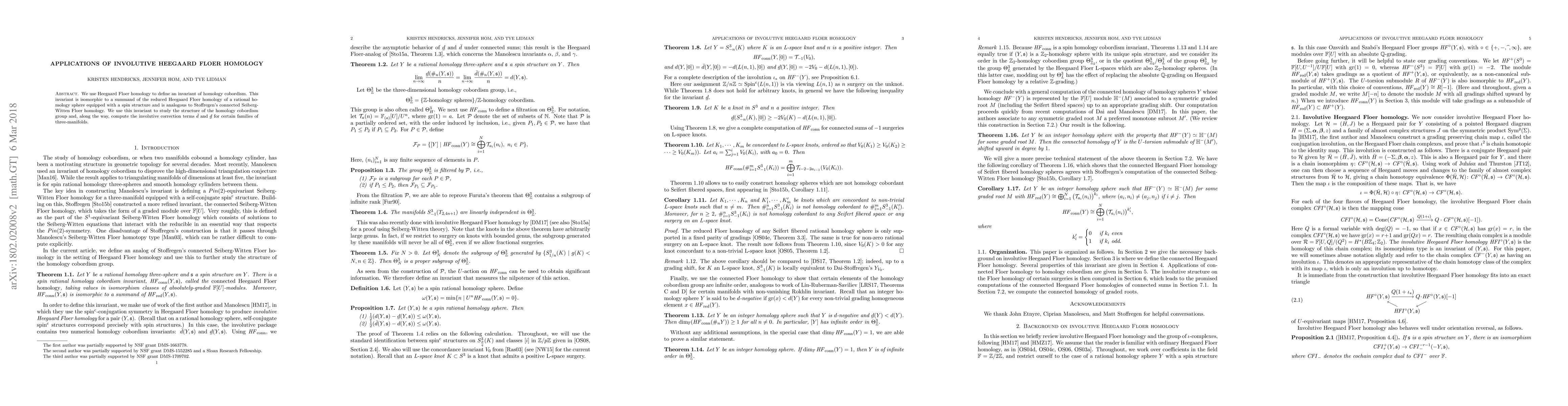We use Heegaard Floer homology to define an invariant of homology cobordism. This invariant is isomorphic to a summand of the reduced Heegaard Floer homology of a rational homology sphere equipped with a spin structure and is analogous to Stoffregen's connected Seiberg-Witten Floer homology. We use this invariant to study the structure of the homology cobordism group and, along the way, compute the involutive correction terms for certain families of three-manifolds.