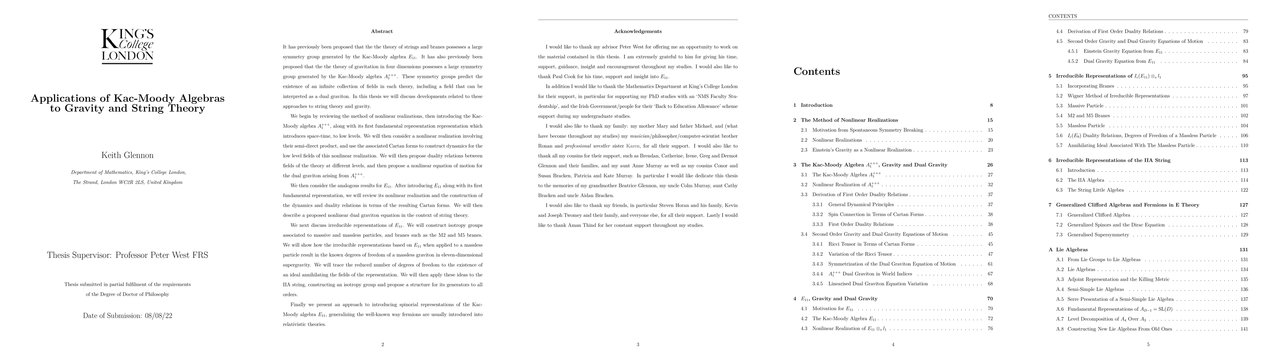 It has previously been proposed that the the theory of strings and branes possesses a large symmetry group generated by the Kac-Moody algebra $E_{11}$. It has also previously been proposed that the the theory of gravitation in four dimensions possesses a large symmetry group generated by the Kac-Moody algebra $A_1^{+++}$. These symmetry groups predict the existence of an infinite collection of fields in each theory, including a field that can be interpreted as a dual graviton. In this thesis we will discuss developments related to these approaches to string theory and gravity. We begin by reviewing the method of nonlinear realizations, then introducing the Kac-Moody algebra $A_1^{+++}$, along with its first fundamental representation representation which introduces space-time, to low levels. We will then consider a nonlinear realization involving their semi-direct product, and use the associated Cartan forms to construct dynamics for the low level fields of this nonlinear realization. We will then propose duality relations between fields of the theory at different levels, and propose a nonlinear equation of motion for the dual graviton arising from $A_1^{+++}$. We then consider the analogous results for $E_{11}$, and describe a proposed nonlinear dual graviton equation in the context of string theory. We next discuss irreducible representations of $E_{11}$. We will construct isotropy groups associated to massive and massless particles, branes such as the M2 and M5 branes, and the IIA string. Finally we present an approach for introducing spinorial representations of the Kac-Moody algebra $E_{11}$.