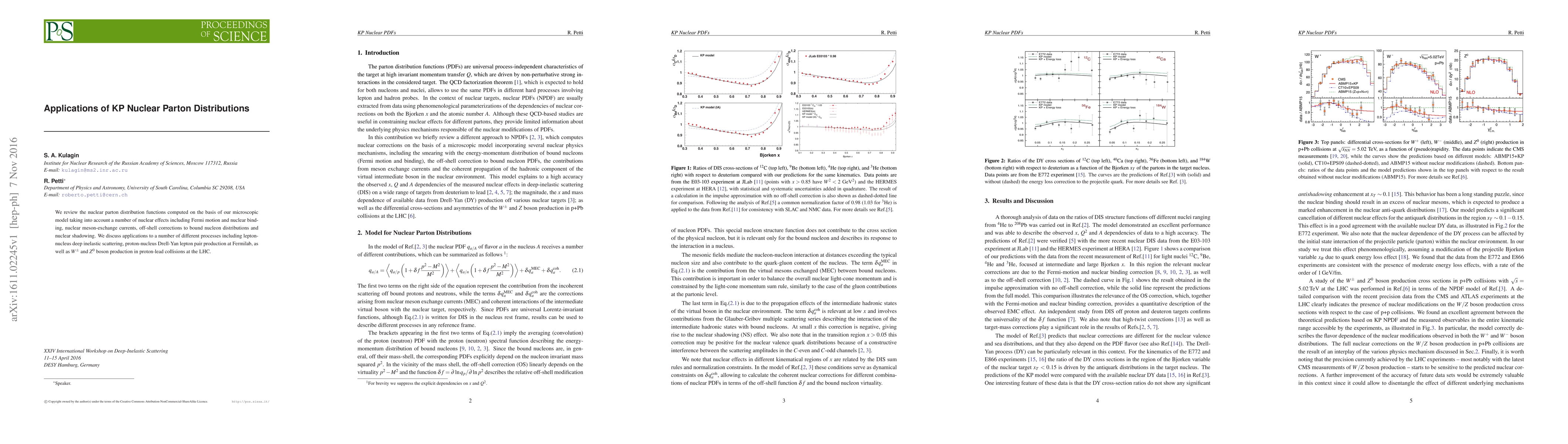 This paper reviews nuclear parton distribution functions derived from a microscopic model considering various nuclear effects, and discusses their applications to processes like lepton-nucleus scattering, proton-nucleus Drell-Yan production, and $W^\pm$ and $Z^0$ boson production in LHC collisions.
