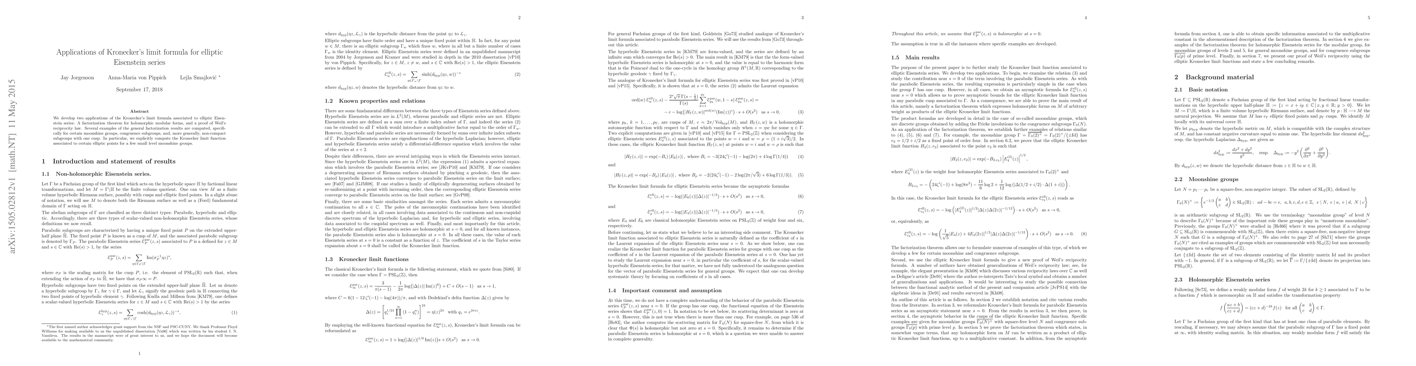 This paper applies Kronecker's limit formula to elliptic Eisenstein series, proving a factorization theorem for holomorphic modular forms and establishing Weil's reciprocity law. It provides explicit computations for specific moonshine groups and non-compact subgroups with one cusp.