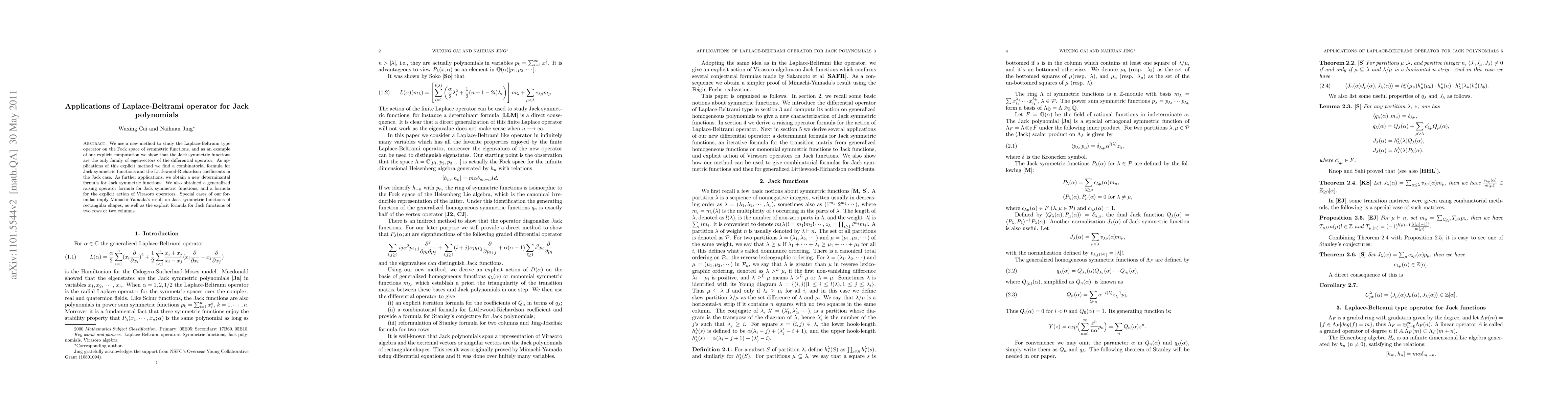 This paper introduces a novel method to apply the Laplace-Beltrami operator on the Fock space, demonstrating that Jack symmetric functions are its unique eigenvectors. It provides combinatorial, determinantal, and raising operator formulas for Jack polynomials, including applications to Littlewood-Richardson coefficients and Virasoro operators.