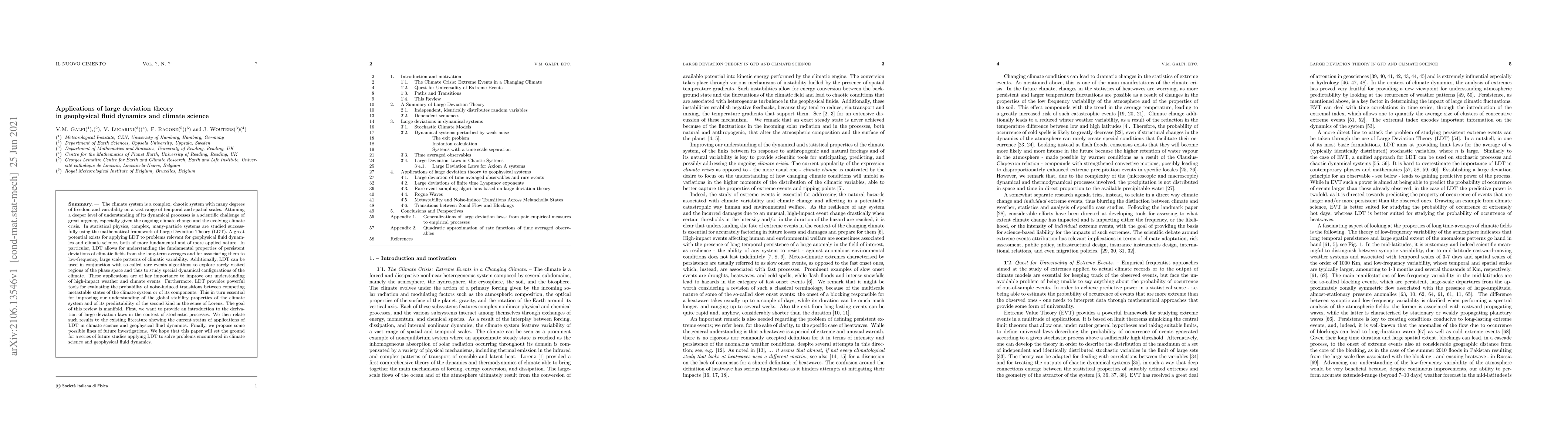 This paper reviews the application of Large Deviation Theory (LDT) to geophysical fluid dynamics and climate science, highlighting its potential to understand persistent deviations from long-term averages and rare climate events. It aims to introduce LDT, discuss its current applications, and propose future research directions.