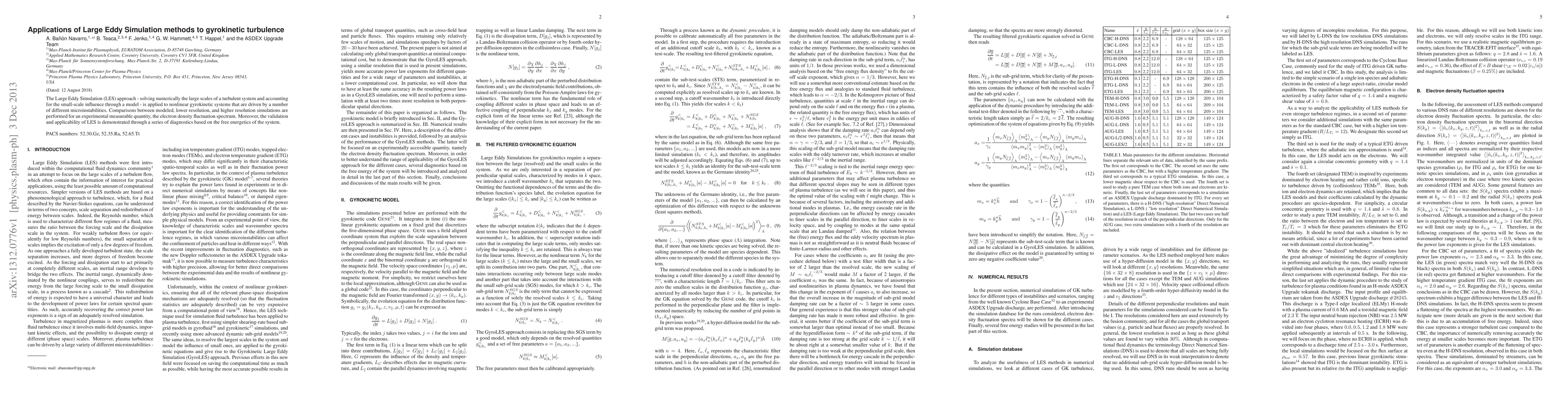 The Large Eddy Simulation (LES) approach - solving numerically the large scales of a turbulent system and accounting for the small-scale influence through a model - is applied to nonlinear gyrokinetic systems that are driven by a number of different microinstabilities. Comparisons between modeled, lower resolution, and higher resolution simulations are performed for an experimental measurable quantity, the electron density fluctuation spectrum. Moreover, the validation and applicability of LES is demonstrated through a series of diagnostics based on the free energetics of the system.