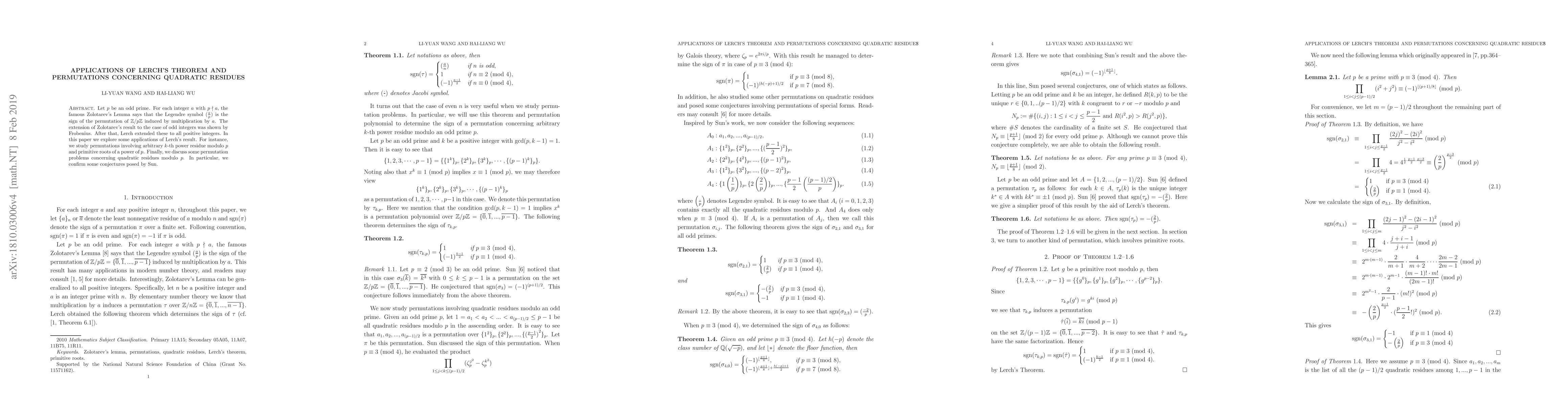 Let $p$ be an odd prime. For each integer $a$ with $p\nmid a$, the famous Zolotarev's Lemma says that the Legendre symbol $(\frac{a}{p})$ is the sign of the permutation of $\Z/p\Z$ induced by multiplication by $a$. The extension of Zolotarev's result to the case of odd integers was shown by Frobenius. After that, Lerch extended these to all positive integers. In this paper we explore some applications of Lerch's result. For instance, we study permutations involving arbitrary $k$-th power residue modulo $p$ and primitive roots of a power of $p$. Finally, we discuss some permutation problems concerning quadratic residues modulo $p$. In particular, we confirm some conjectures posed by Sun.