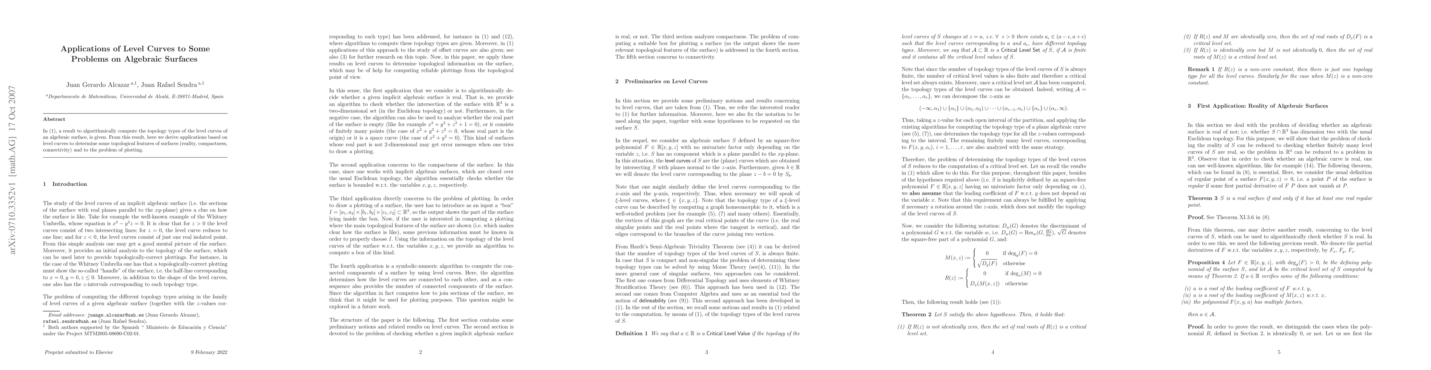 In a previous work of the authors, a result to algorithmically compute the topology types of the level curves of an algebraic surface, is given. From this result, here we derive applications based on level curves to determine some topological features of surfaces (reality, compactness, connectivity) and to the problem of plotting.