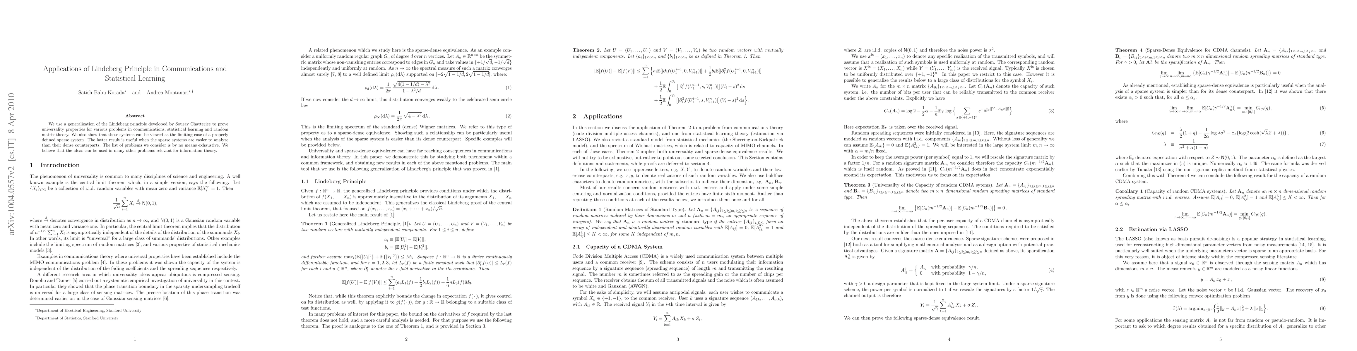 We use a generalization of the Lindeberg principle developed by Sourav Chatterjee to prove universality properties for various problems in communications, statistical learning and random matrix theory. We also show that these systems can be viewed as the limiting case of a properly defined sparse system. The latter result is useful when the sparse systems are easier to analyze than their dense counterparts. The list of problems we consider is by no means exhaustive. We believe that the ideas can be used in many other problems relevant for information theory.