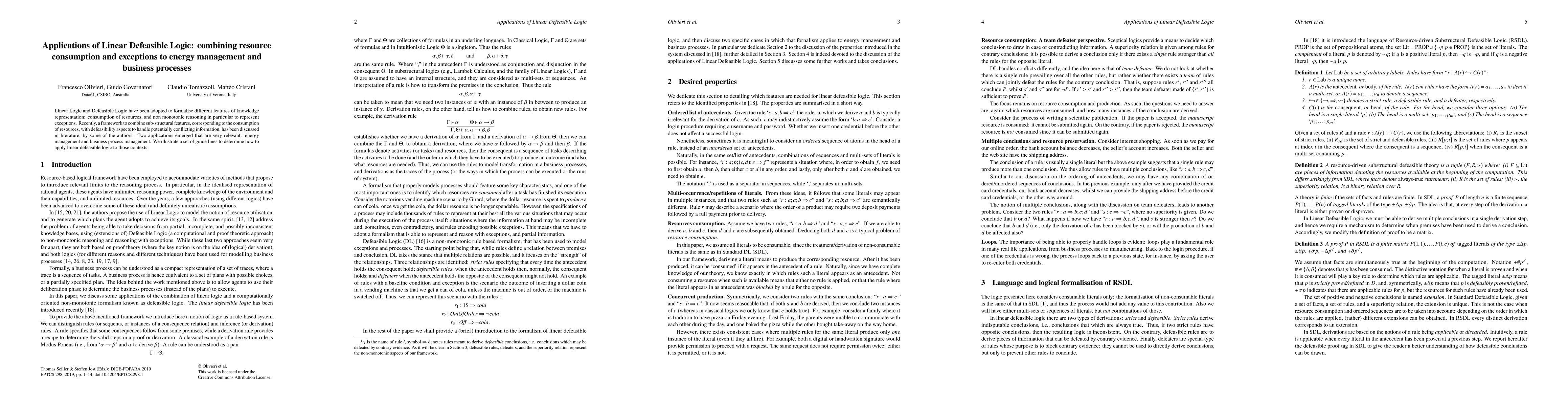 This paper explores the integration of linear defeasible logic to manage resource consumption and exceptions in energy and business processes. It provides guidelines for applying this logic to handle conflicting information and optimize resource use in these domains.