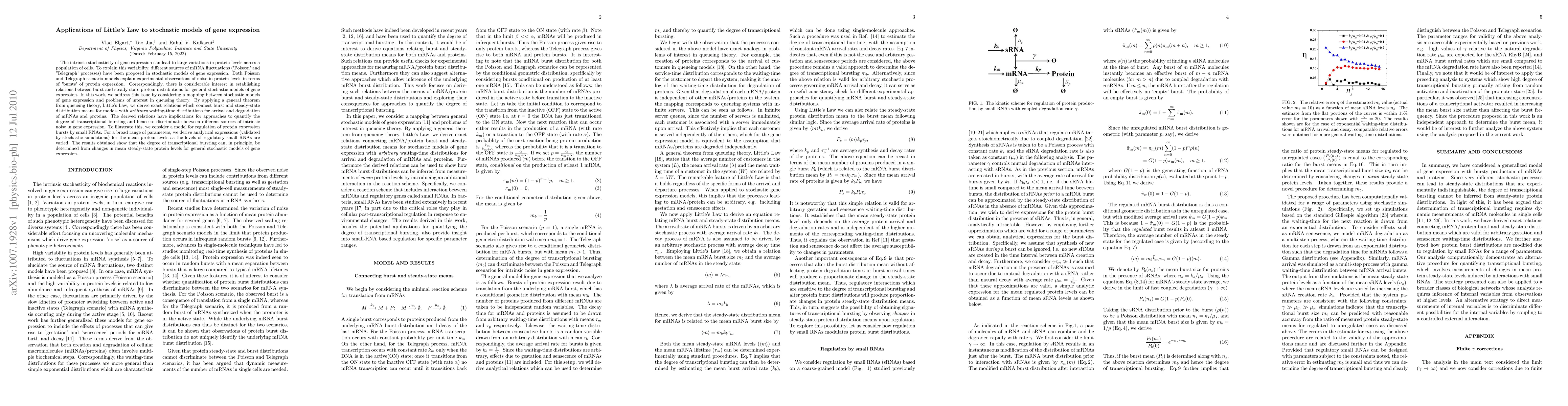 This research applies Little's Law from queueing theory to stochastic models of gene expression, deriving exact relations between burst and steady-state protein distributions. This aids in quantifying transcriptional bursting and distinguishing different sources of intrinsic noise, illustrated through a model of protein expression regulation by small RNAs.