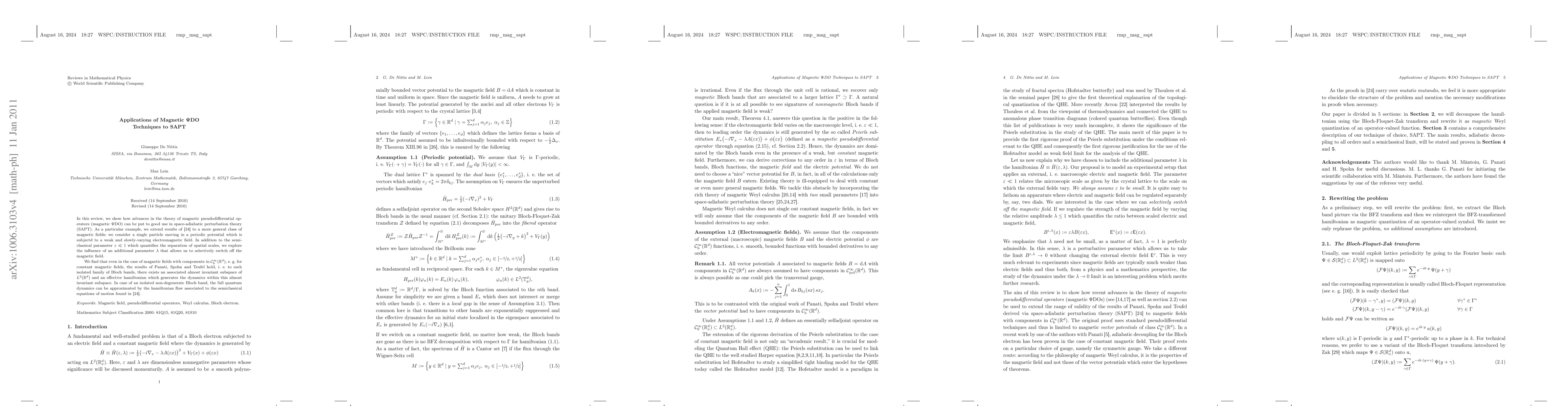 In this review, we show how advances in the theory of magnetic pseudodifferential operators (magnetic $\Psi$DO) can be put to good use in space-adiabatic perturbation theory (SAPT). As a particular example, we extend results of [PST03] to a more general class of magnetic fields: we consider a single particle moving in a periodic potential which is subjectd to a weak and slowly-varying electromagnetic field. In addition to the semiclassical parameter $\eps \ll 1$ which quantifies the separation of spatial scales, we explore the influence of additional parameters that allow us to selectively switch off the magnetic field. We find that even in the case of magnetic fields with components in $C_b^{\infty}(\R^d)$, e. g. for constant magnetic fields, the results of Panati, Spohn and Teufel hold, i.e. to each isolated family of Bloch bands, there exists an associated almost invariant subspace of $L^2(\R^d)$ and an effective hamiltonian which generates the dynamics within this almost invariant subspace. In case of an isolated non-degenerate Bloch band, the full quantum dynamics can be approximated by the hamiltonian flow associated to the semiclassical equations of motion found in [PST03].