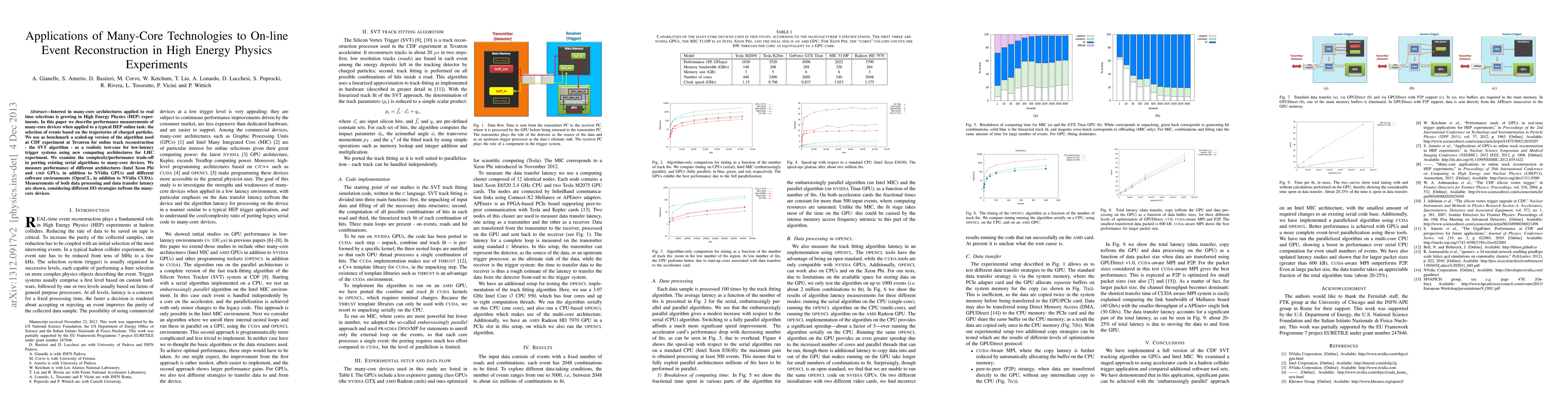 Interest in many-core architectures applied to real time selections is growing in High Energy Physics (HEP) experiments. In this paper we describe performance measurements of many-core devices when applied to a typical HEP online task: the selection of events based on the trajectories of charged particles. We use as benchmark a scaled-up version of the algorithm used at CDF experiment at Tevatron for online track reconstruction - the SVT algorithm - as a realistic test-case for low-latency trigger systems using new computing architectures for LHC experiment. We examine the complexity/performance trade-off in porting existing serial algorithms to many-core devices. We measure performance of different architectures (Intel Xeon Phi and AMD GPUs, in addition to NVidia GPUs) and different software environments (OpenCL, in addition to NVidia CUDA). Measurements of both data processing and data transfer latency are shown, considering different I/O strategies to/from the many-core devices.