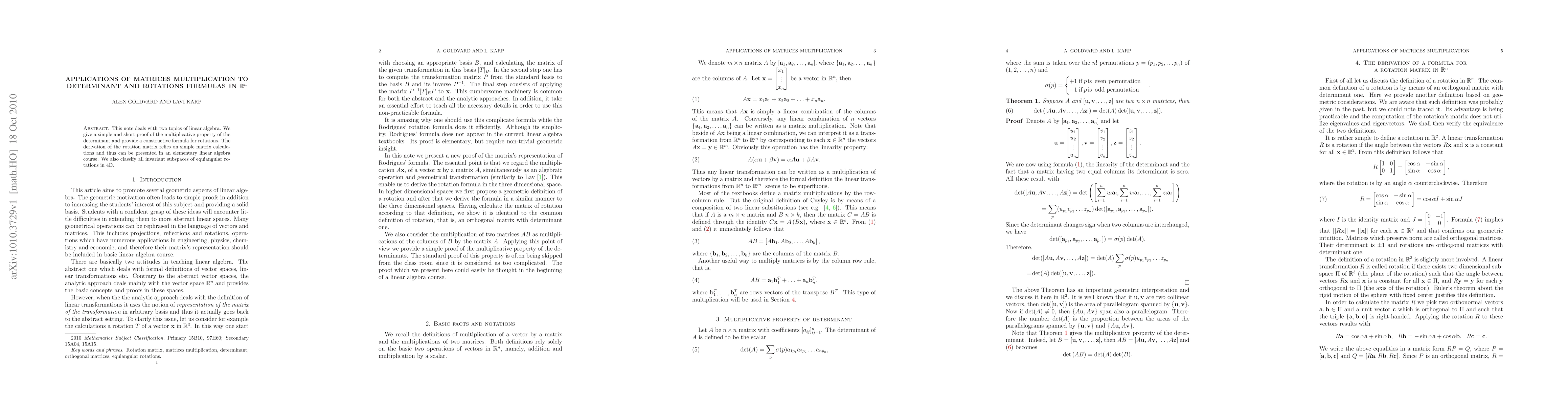 This note deals with two topics of linear algebra. We give a simple and short proof of the multiplicative property of the determinant and provide a constructive formula for rotations. The derivation of the rotation matrix relies on simple matrix calculations and thus can be presented in an elementary linear algebra course. We also classify all invariant subspaces of equiangular rotations in 4D.