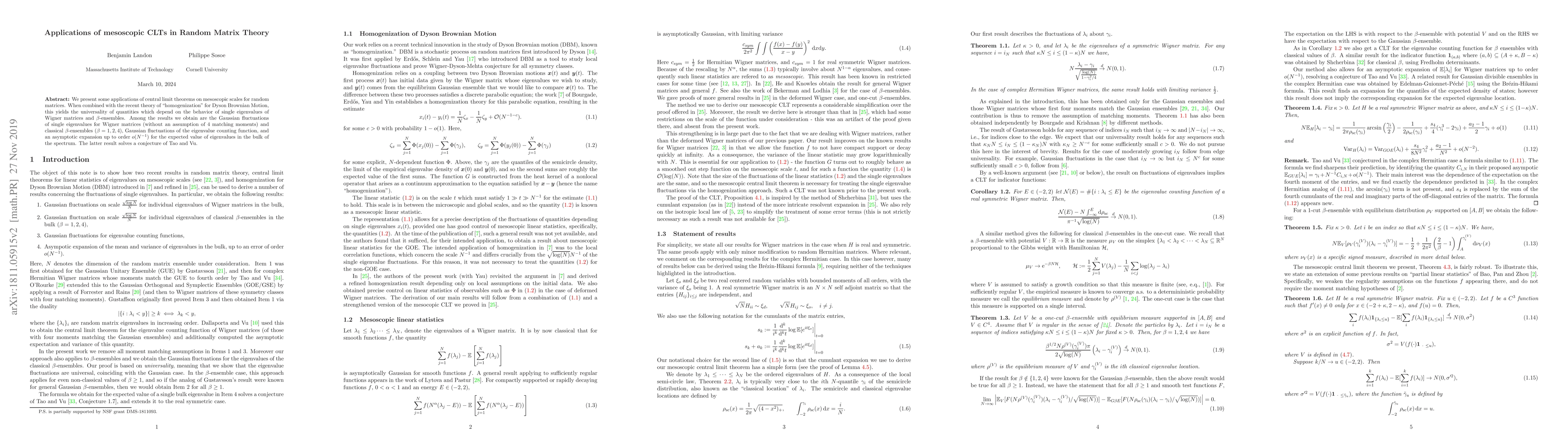 We present some applications of central limit theorems on mesoscopic scales for random matrices. When combined with the recent theory of "homogenization" for Dyson Brownian Motion, this yields the universality of quantities which depend on the behavior of single eigenvalues of Wigner matrices and $\beta$-ensembles. Among the results we obtain are the Gaussian fluctuations of single eigenvalues for Wigner matrices (without an assumption of 4 matching moments) and classical $\beta$-ensembles ($\beta=1, 2, 4$), Gaussian fluctuations of the eigenvalue counting function, and an asymptotic expansion up to order $o(N^{-1})$ for the expected value of eigenvalues in the bulk of the spectrum. The latter result solves a conjecture of Tao and Vu.