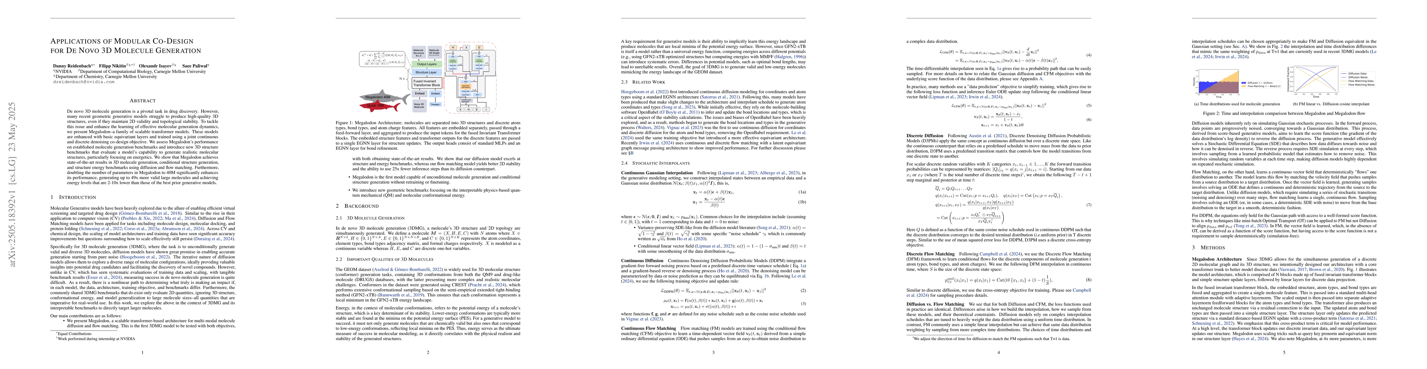 The research introduces Megalodon, a family of scalable transformer models enhanced with basic equivariant layers for de novo 3D molecule generation. These models are trained using a joint continuous and discrete denoising co-design objective.
