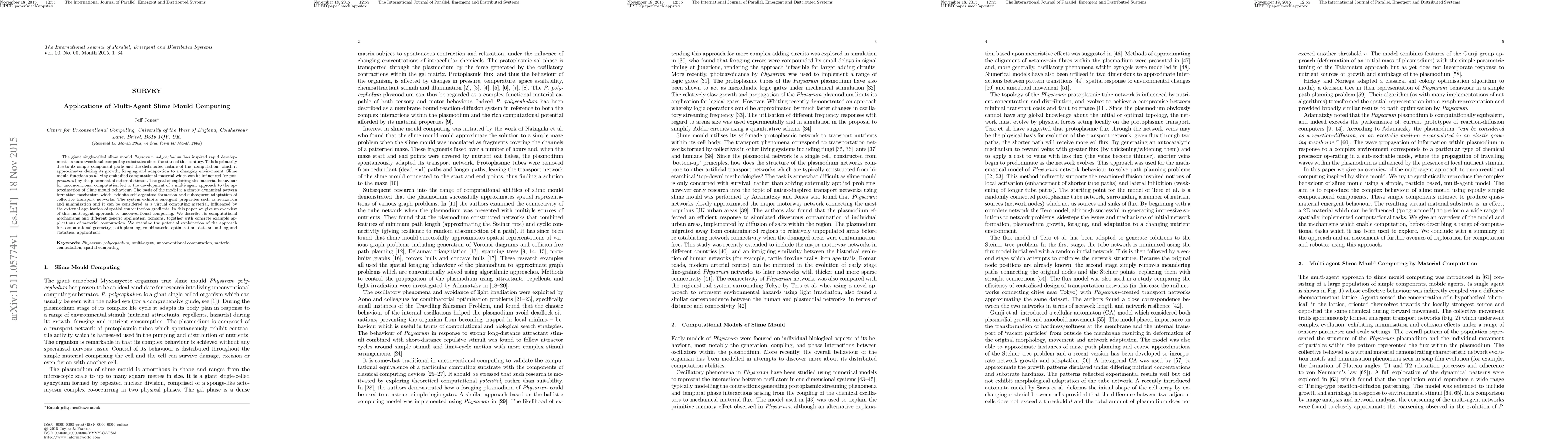 This paper explores the use of a multi-agent approach to simulate the computational behavior of slime mould, focusing on its self-organised network formation and adaptation. It examines potential applications in computational geometry, path planning, and combinatorial optimisation, highlighting the material's emergent properties for unconventional computing tasks.