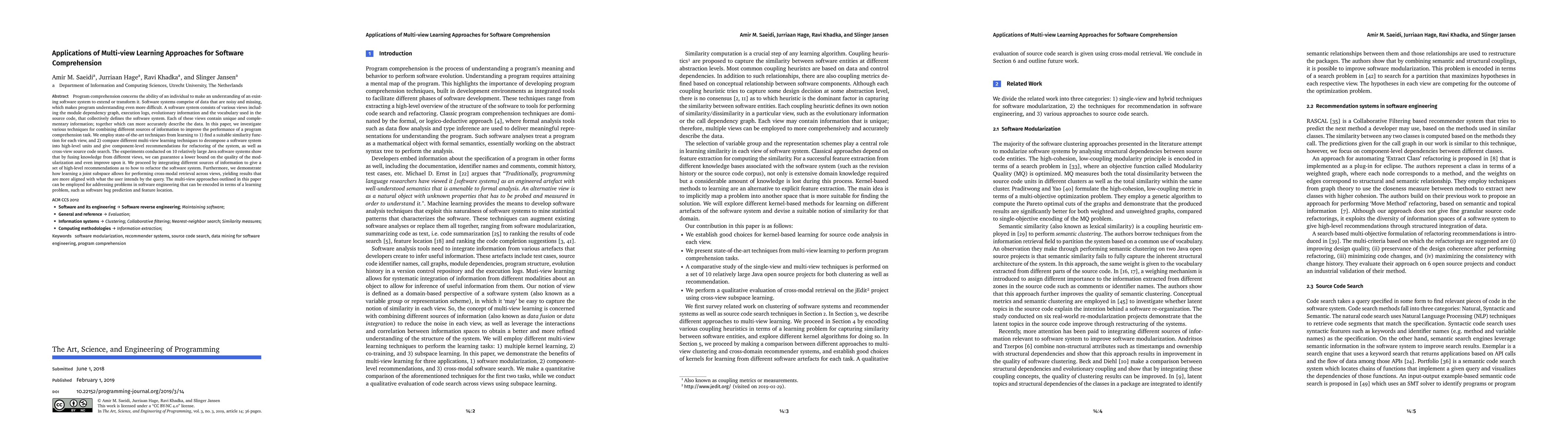 Program comprehension concerns the ability of an individual to make an understanding of an existing software system to extend or transform it. Software systems comprise of data that are noisy and missing, which makes program understanding even more difficult. A software system consists of various views including the module dependency graph, execution logs, evolutionary information and the vocabulary used in the source code, that collectively defines the software system. Each of these views contain unique and complementary information; together which can more accurately describe the data. In this paper, we investigate various techniques for combining different sources of information to improve the performance of a program comprehension task. We employ state-of-the-art techniques from learning to 1) find a suitable similarity function for each view, and 2) compare different multi-view learning techniques to decompose a software system into high-level units and give component-level recommendations for refactoring of the system, as well as cross-view source code search. The experiments conducted on 10 relatively large Java software systems show that by fusing knowledge from different views, we can guarantee a lower bound on the quality of the modularization and even improve upon it. We proceed by integrating different sources of information to give a set of high-level recommendations as to how to refactor the software system. Furthermore, we demonstrate how learning a joint subspace allows for performing cross-modal retrieval across views, yielding results that are more aligned with what the user intends by the query. The multi-view approaches outlined in this paper can be employed for addressing problems in software engineering that can be encoded in terms of a learning problem, such as software bug prediction and feature location.