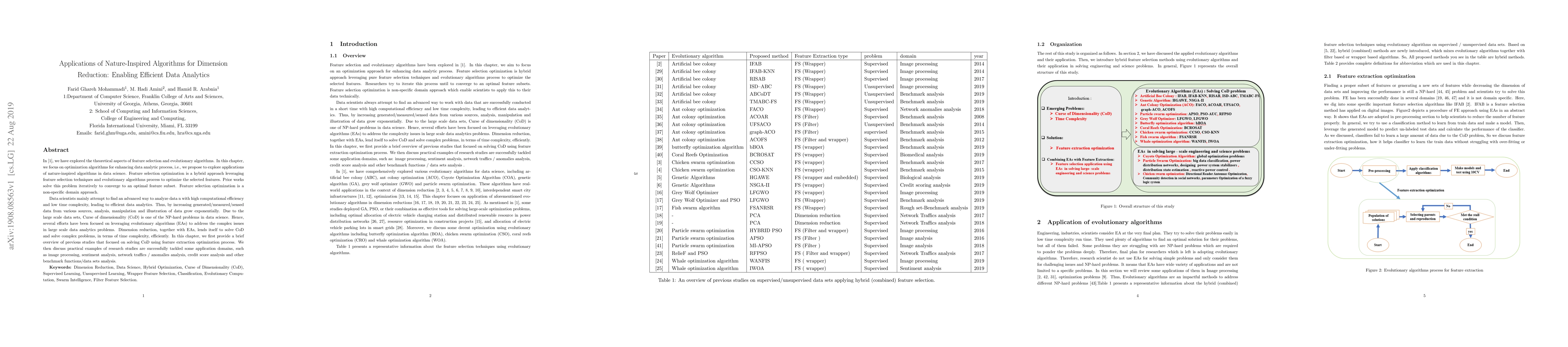 This paper explores the use of nature-inspired algorithms, particularly evolutionary algorithms, for optimizing feature selection and reducing dimensionality in large datasets. It highlights how these methods address the Curse of Dimensionality, improving computational efficiency and time complexity in data analytics across various domains.