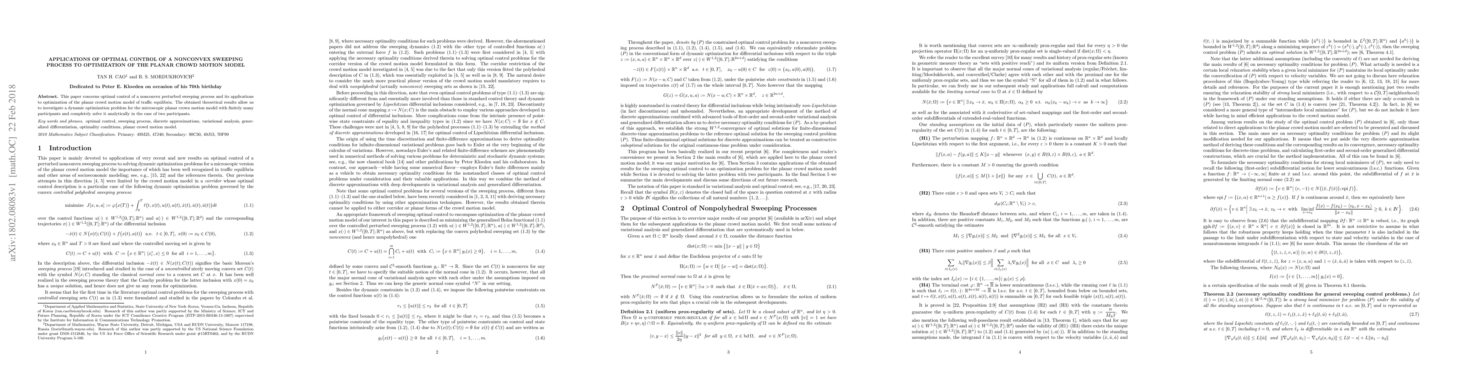 This paper explores optimal control of a nonconvex perturbed sweeping process and applies it to optimize the planar crowd motion model for traffic equilibria. It analytically solves the dynamic optimization problem for two participants.