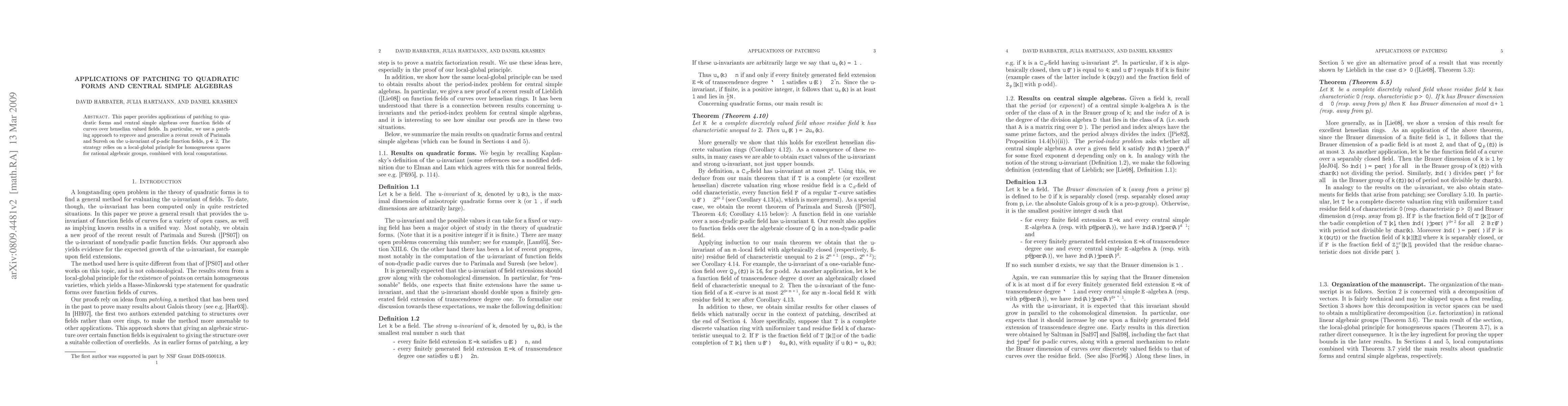 This paper applies a patching technique to quadratic forms and central simple algebras over function fields, reprovving and generalizing a result on the u-invariant of p-adic function fields for odd primes p, using a local-global principle for rational algebraic groups.