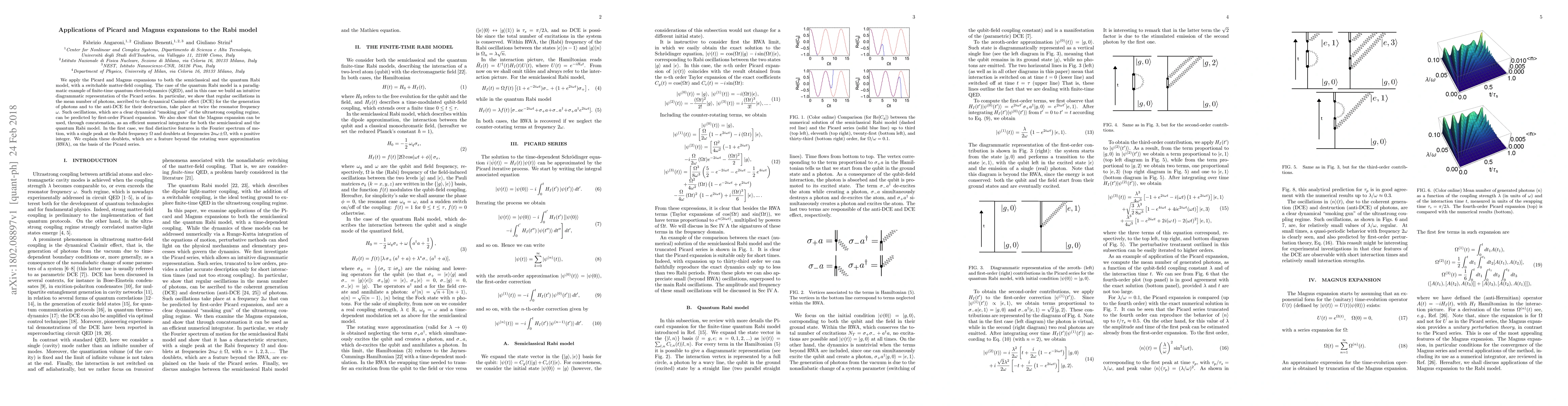 This paper applies Picard and Magnus expansions to the Rabi model, demonstrating that regular photon oscillations at twice the resonator frequency, indicative of ultrastrong coupling, can be predicted by first-order Picard expansion. The Magnus expansion serves as an efficient numerical integrator, revealing distinct Fourier spectrum features in the semiclassical case, with peaks at Rabi frequency and its multiples.