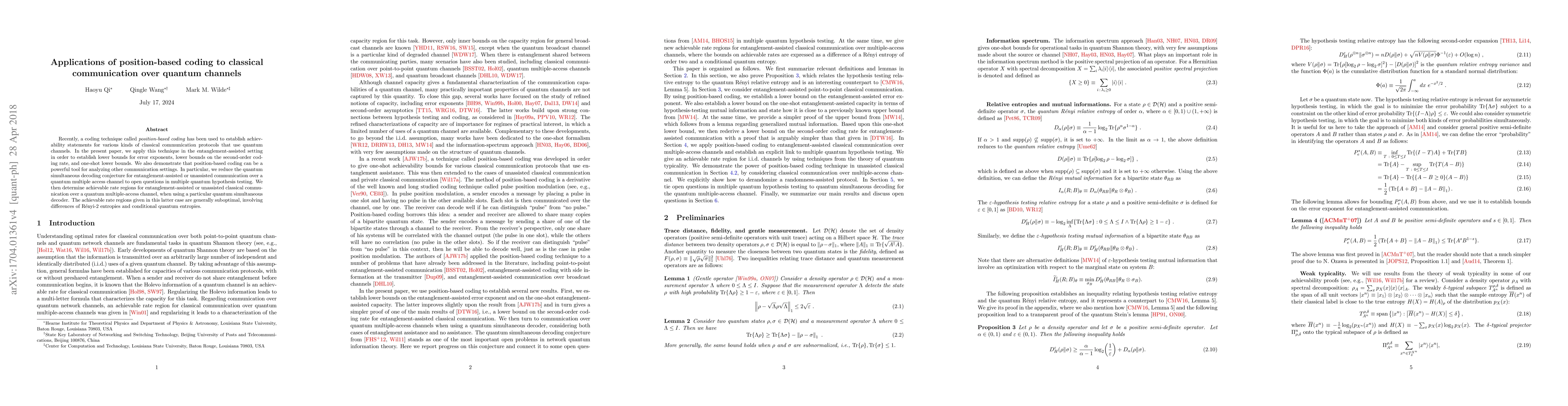 This paper applies position-based coding to establish lower bounds and achievable rate regions for classical communication over quantum channels, particularly in entanglement-assisted settings. It also links the quantum simultaneous decoding conjecture to multiple quantum hypothesis testing.