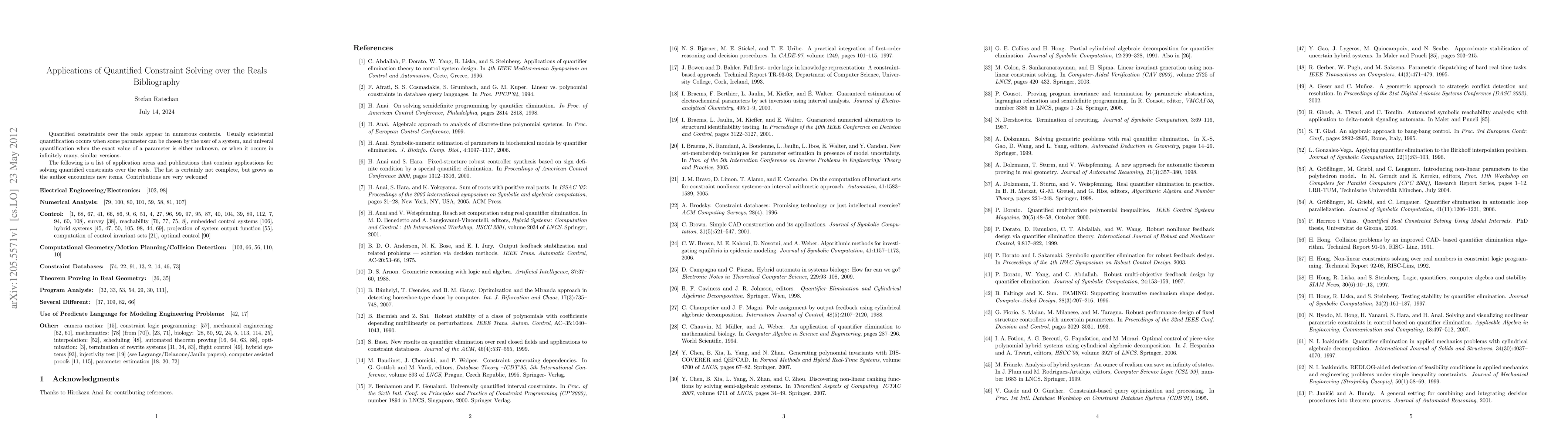 Quantified constraints over the reals appear in numerous contexts. Usually existential quantification occurs when some parameter can be chosen by the user of a system, and univeral quantification when the exact value of a parameter is either unknown, or when it occurs in infinitely many, similar versions. The following is a list of application areas and publications that contain applications for solving quantified constraints over the reals. The list is certainly not complete, but grows as the author encounters new items. Contributions are very welcome!