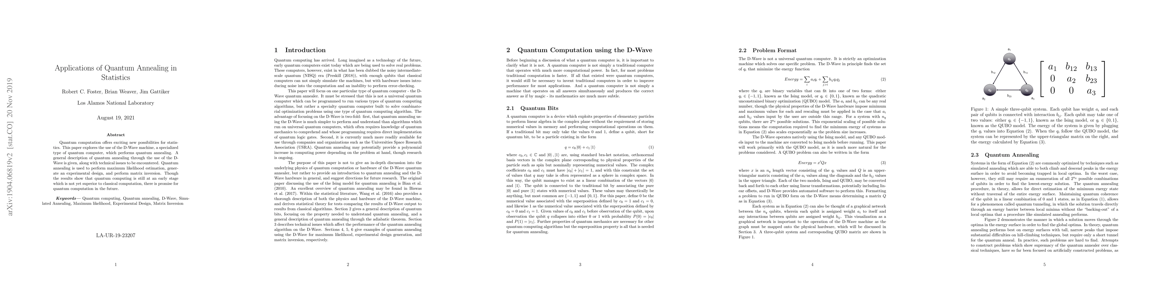 Quantum computation offers exciting new possibilities for statistics. This paper explores the use of the D-Wave machine, a specialized type of quantum computer, which performs quantum annealing. A general description of quantum annealing through the use of the D-Wave is given, along with technical issues to be encountered. Quantum annealing is used to perform maximum likelihood estimation, generate an experimental design, and perform matrix inversion. Though the results show that quantum computing is still at an early stage which is not yet superior to classical computation, there is promise for quantum computation in the future.