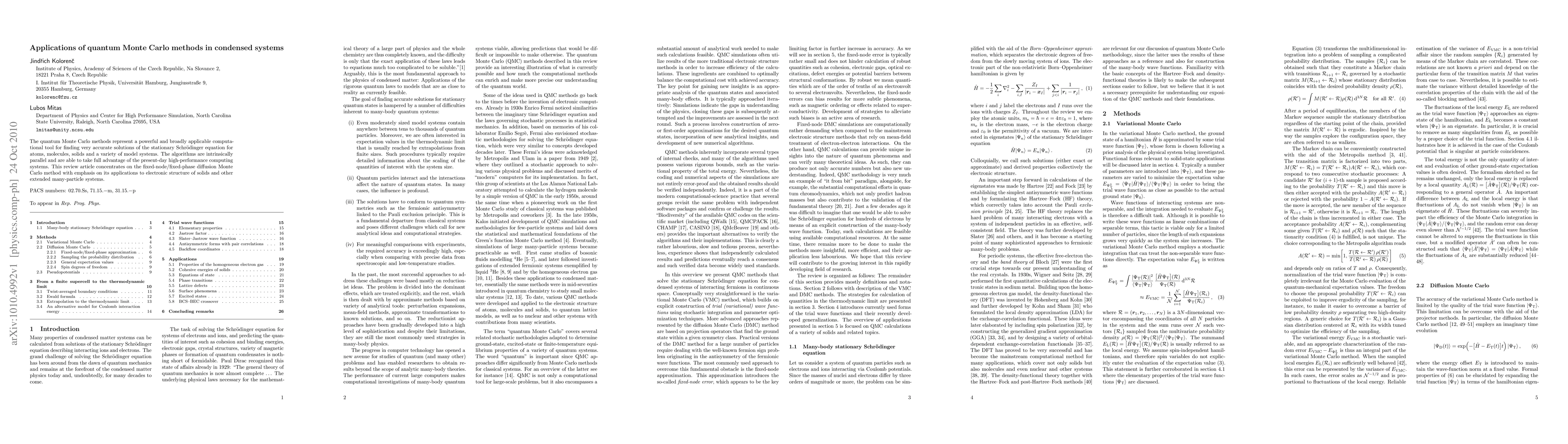 This paper reviews the quantum Monte Carlo methods, particularly the fixed-node/fixed-phase diffusion Monte Carlo approach, as powerful computational tools for accurately solving the stationary Schrödinger equation in condensed systems, including solids and molecules, leveraging modern high-performance computing.