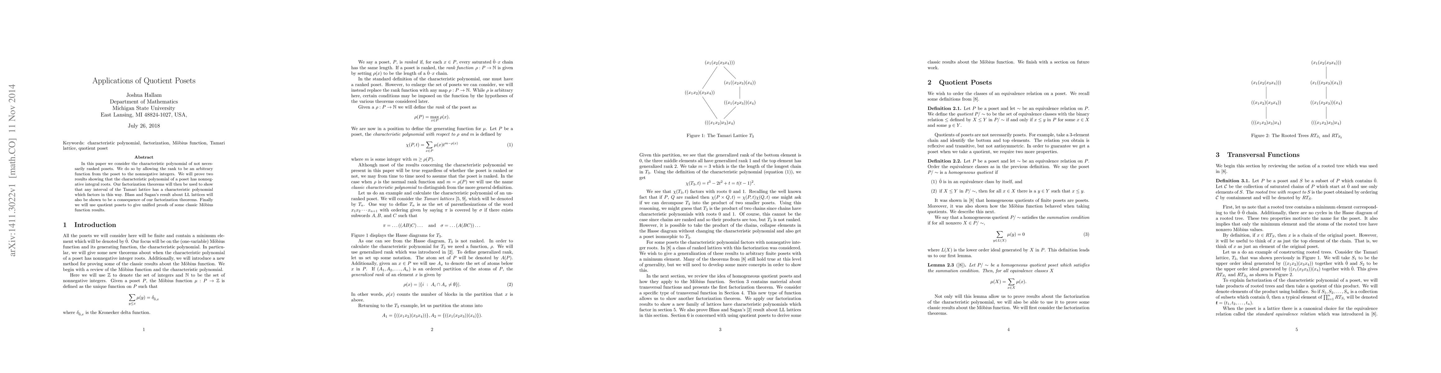 In this paper we consider the characteristic polynomial of not necessarily ranked posets. We do so by allowing the rank to be an arbitrary function from the poset to the nonnegative integers. We will prove two results showing that the characteristic polynomial of a poset has nonnegative integral roots. Our factorization theorems will then be used to show that any interval of the Tamari lattice has a characteristic polynomial which factors in this way. Blass and Sagan's result about LL lattices will also be shown to be a consequence of our factorization theorems. Finally we will use quotient posets to give unified proofs of some classic M\"obius function results.
