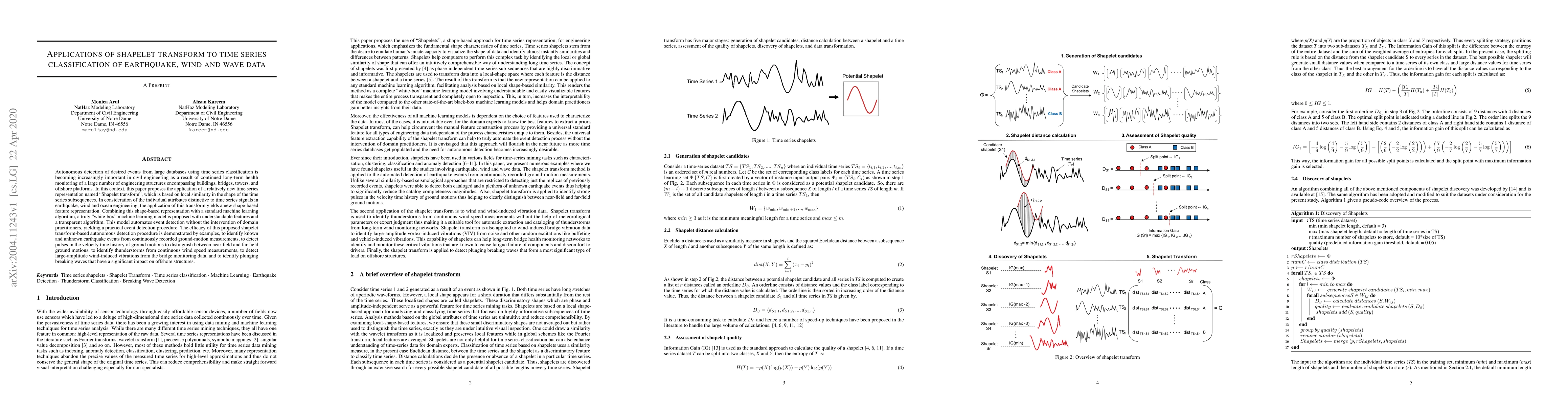 Autonomous detection of desired events from large databases using time series classification is becoming increasingly important in civil engineering as a result of continued long-term health monitoring of a large number of engineering structures encompassing buildings, bridges, towers, and offshore platforms. In this context, this paper proposes the application of a relatively new time series representation named "Shapelet transform", which is based on local similarity in the shape of the time series subsequences. In consideration of the individual attributes distinctive to time series signals in earthquake, wind and ocean engineering, the application of this transform yields a new shape-based feature representation. Combining this shape-based representation with a standard machine learning algorithm, a truly "white-box" machine learning model is proposed with understandable features and a transparent algorithm. This model automates event detection without the intervention of domain practitioners, yielding a practical event detection procedure. The efficacy of this proposed shapelet transform-based autonomous detection procedure is demonstrated by examples, to identify known and unknown earthquake events from continuously recorded ground-motion measurements, to detect pulses in the velocity time history of ground motions to distinguish between near-field and far-field ground motions, to identify thunderstorms from continuous wind speed measurements, to detect large-amplitude wind-induced vibrations from the bridge monitoring data, and to identify plunging breaking waves that have a significant impact on offshore structures.