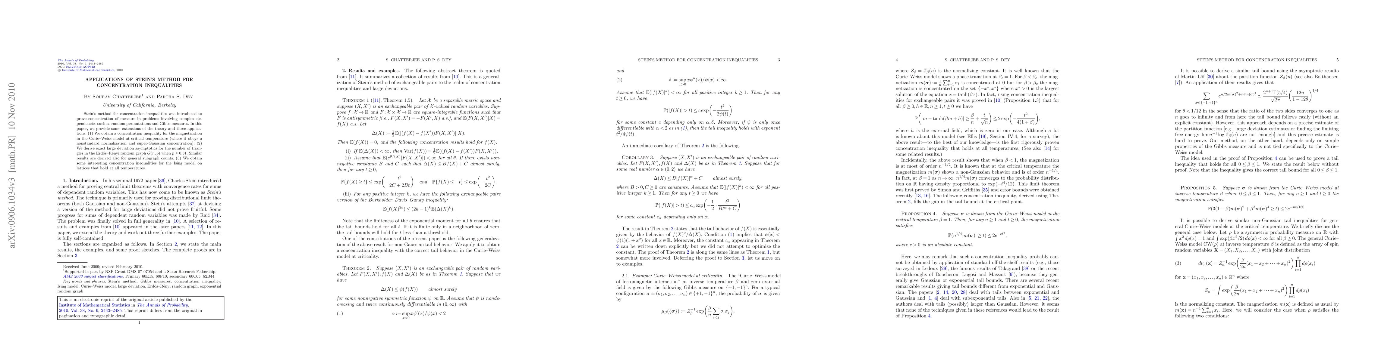 This paper extends Stein's method for concentration inequalities, applying it to derive novel concentration results for the magnetization in the Curie-Weiss model, large deviation asymptotics for subgraph counts in random graphs, and concentration inequalities for the Ising model on lattices.