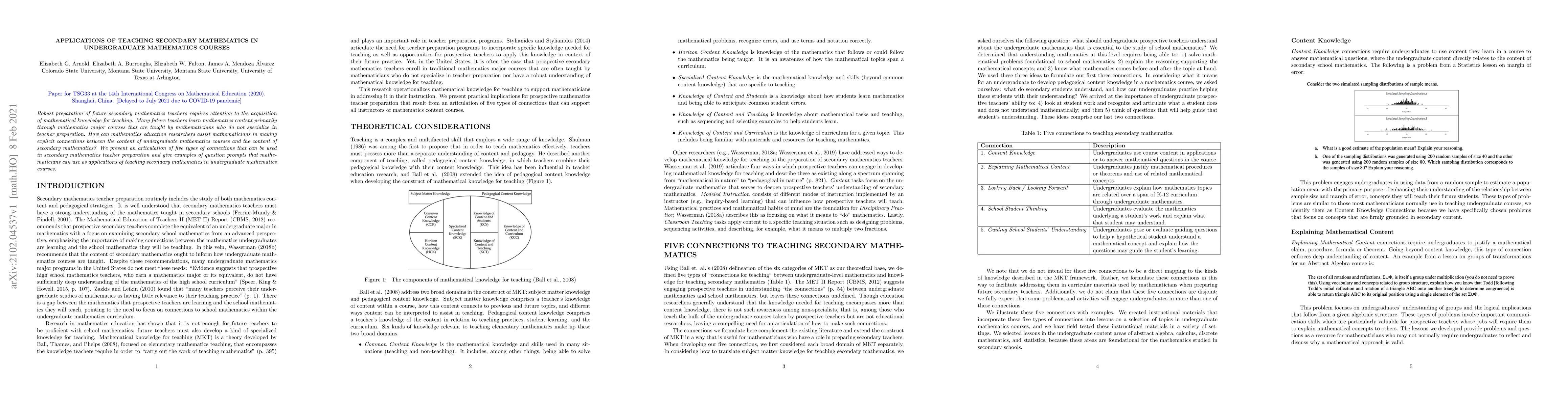 Robust preparation of future secondary mathematics teachers requires attention to the acquisition of mathematical knowledge for teaching. Many future teachers learn mathematics content primarily through mathematics major courses that are taught by mathematicians who do not specialize in teacher preparation. How can mathematics education researchers assist mathematicians in making explicit connections between the content of undergraduate mathematics courses and the content of secondary mathematics? We present an articulation of five types of connections that can be used in secondary mathematics teacher preparation and give examples of question prompts that mathematicians can use as applications of teaching secondary mathematics in undergraduate mathematics courses.