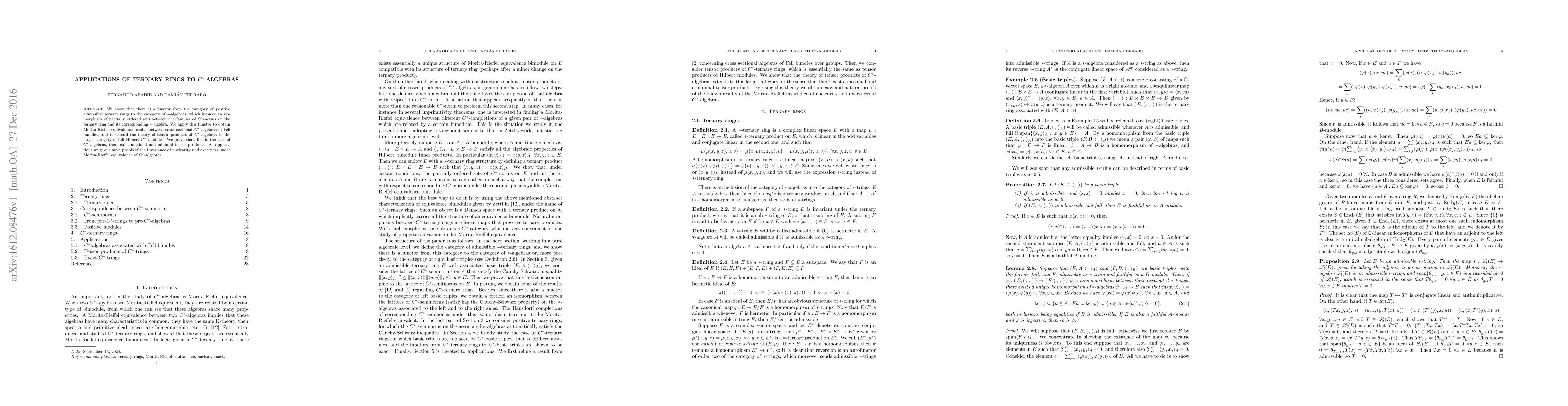 This paper establishes a functor linking positive admissible ternary rings to $*$-algebras, demonstrating an isomorphism between $C^*$-norms on ternary rings and their corresponding $*$-algebras. It applies this to derive Morita-Rieffel equivalence for cross sectional $C^*$-algebras and extends tensor product theory for $C^*$-algebras to full Hilbert $C^*$-modules, proving the existence of maximal and minimal tensor products.