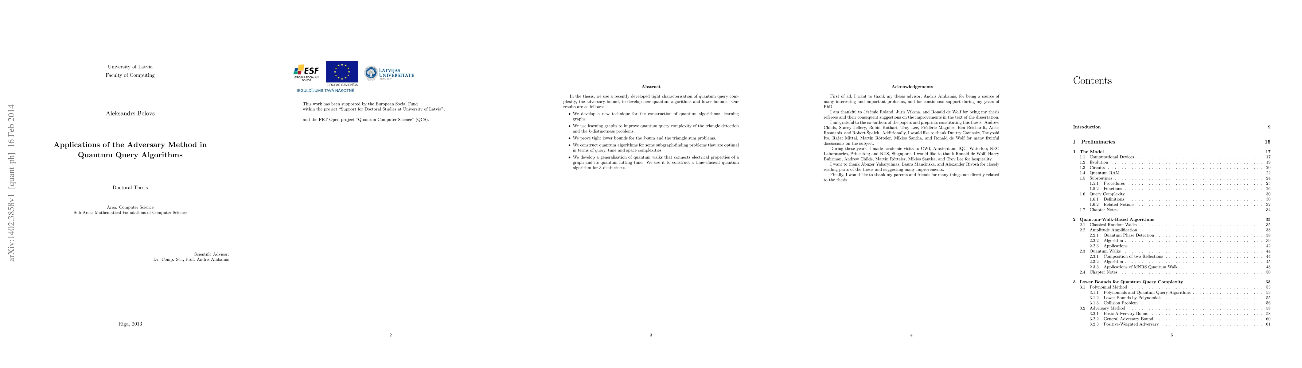 In the thesis, we use a recently developed tight characterisation of quantum query complexity, the adversary bound, to develop new quantum algorithms and lower bounds. Our results are as follows: * We develop a new technique for the construction of quantum algorithms: learning graphs. * We use learning graphs to improve quantum query complexity of the triangle detection and the $k$-distinctness problems. * We prove tight lower bounds for the $k$-sum and the triangle sum problems. * We construct quantum algorithms for some subgraph-finding problems that are optimal in terms of query, time and space complexities. * We develop a generalisation of quantum walks that connects electrical properties of a graph and its quantum hitting time. We use it to construct a time-efficient quantum algorithm for 3-distinctness.