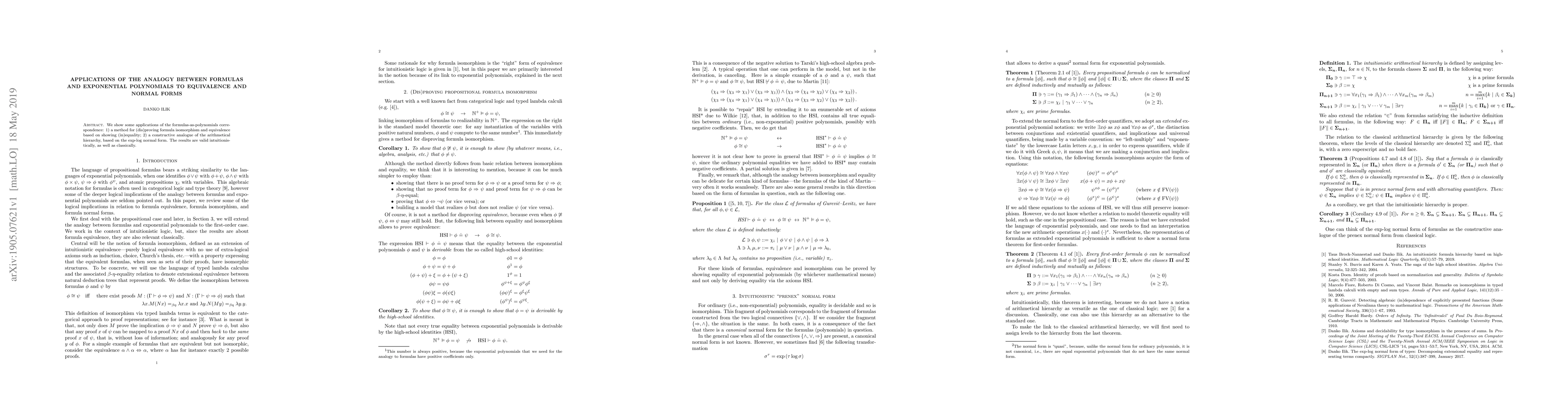 We show some applications of the formulas-as-polynomials correspondence: 1) a method for (dis)proving formula isomorphism and equivalence based on showing (in)equality; 2) a constructive analogue of the arithmetical hierarchy, based on the exp-log normal form. The results are valid intuitionistically, as well as classically.