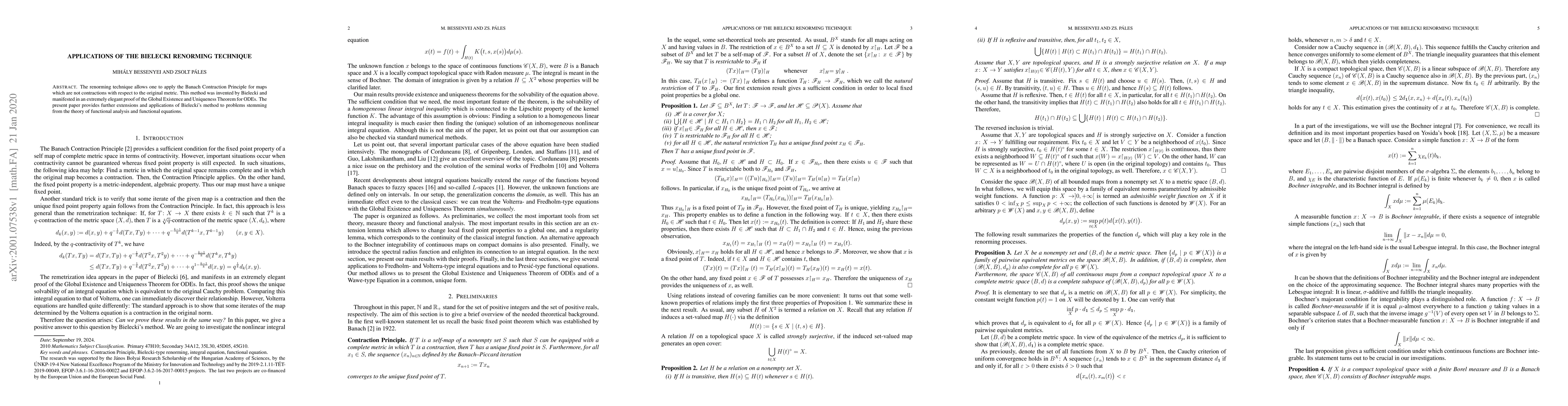 The renorming technique allows one to apply the Banach Contraction Principle for maps which are not contractions with respect to the original metric. This method was invented by Bielecki and manifested in an extremely elegant proof of the Global Existence and Uniqueness Theorem for ODEs. The present paper provides further extensions and applications of Bielecki's method to problems stemming from the theory of functional analysis and functional equations.