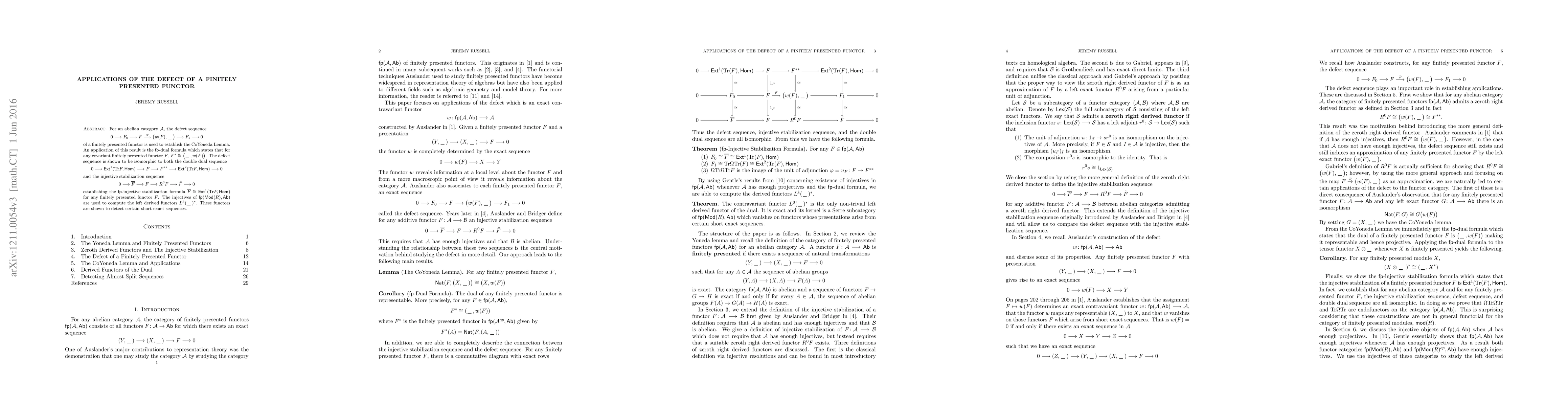 This paper explores the defect sequence of a finitely presented functor in an abelian category to establish the CoYoneda Lemma, leading to the $\textsf{fp}$-dual formula. It further demonstrates the $\textsf{fp}$-injective stabilization formula using injectives in $\textsf{fp}(\textsf{Mod}(R),\textsf{Ab})$ and shows that left derived functors can detect specific short exact sequences.