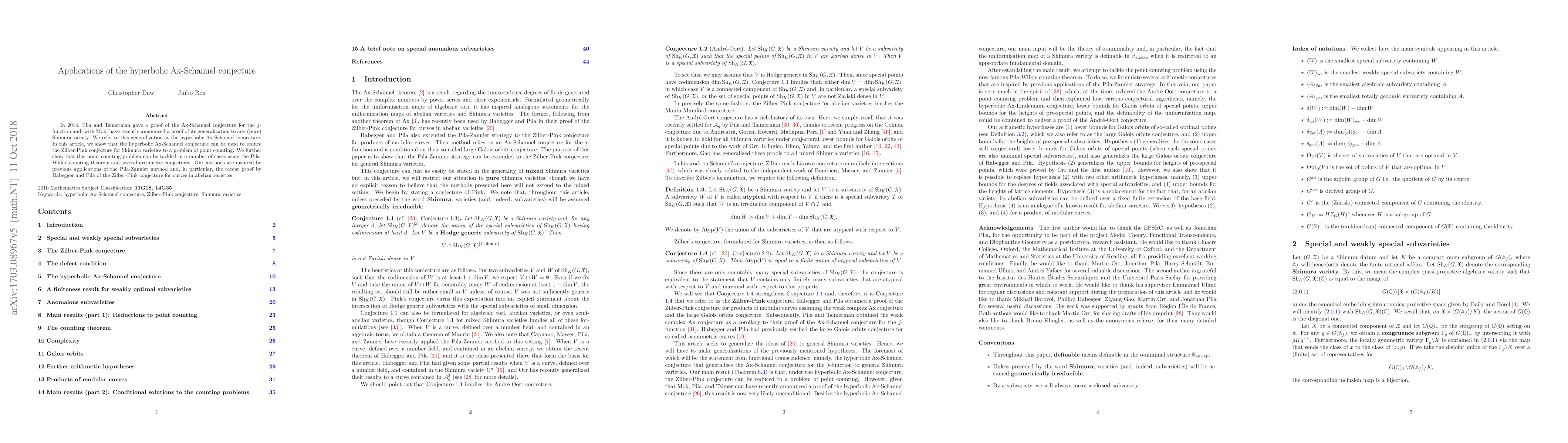 The novelty of this work lies in its reduction of a complex Diophantine problem (the Zilber-Pink conjecture for Shimura varieties) to a counting problem, facilitated by the hyperbolic Ax-Schanuel conjecture, thereby opening new avenues for tackling such conjectures using arithmetic geometry techniques.