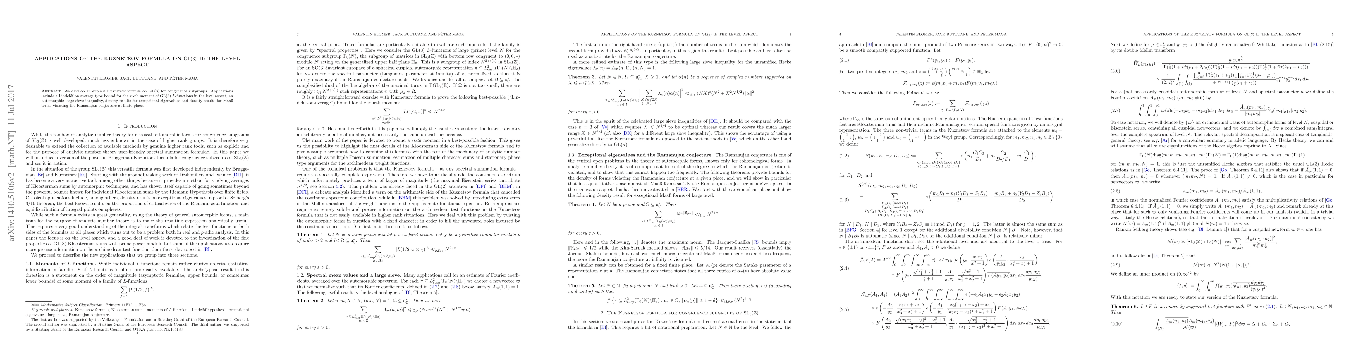 This paper develops an explicit Kuznetsov formula on GL(3) for congruence subgroups, leading to applications including a Lindelof-type bound for the sixth moment of GL(3) L-functions, an automorphic large sieve inequality, and density results for exceptional eigenvalues and Maass forms violating the Ramanujan conjecture.