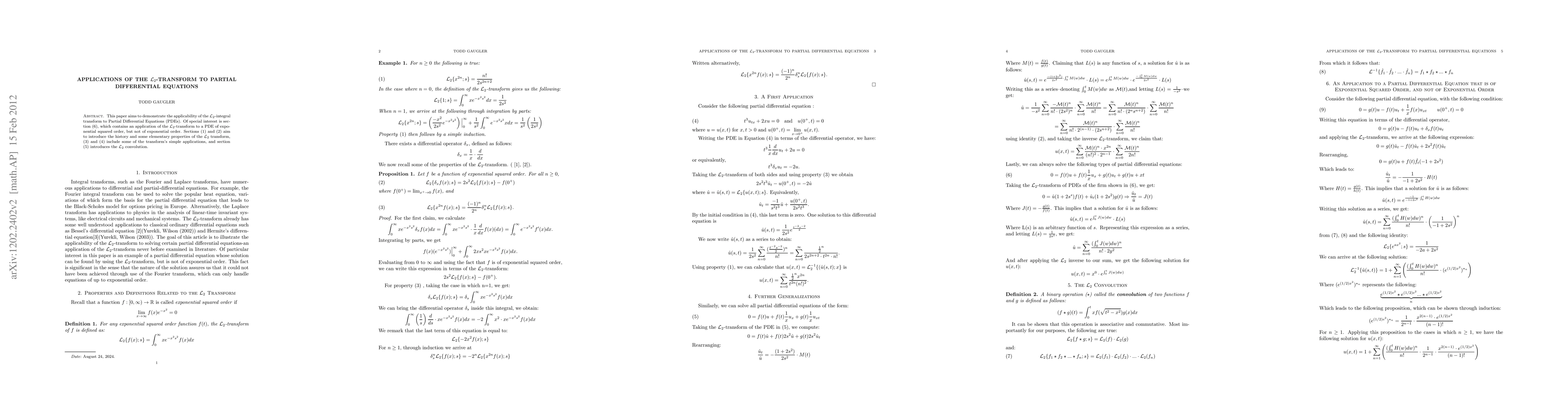 This paper aims to demonstrate the applicability of the L_2-integral transform to Partial Differential Equations (PDEs). Of special interest is section (6), which contains an application of the L_2-transform to a PDE of exponential squared order, but not of exponential order. Sections (1) and (2) aim to introduce the history and some elementary properties of the L_2-transform, (3) and (4) include some of the transform's simple applications, and section (5) introduces the L_2 convolution.