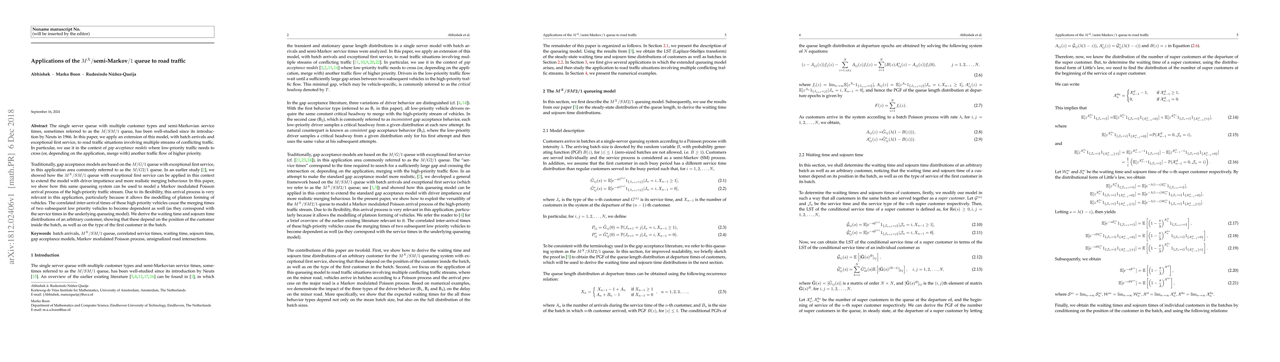 The single server queue with multiple customer types and semi-Markovian service times, sometimes referred to as the $M/SM/1$ queue, has been well-studied since its introduction by Neuts in 1966. In this paper, we apply an extension of this model, with batch arrivals and exceptional first service, to road traffic situations involving multiple streams of conflicting traffic. In particular, we use it in the context of gap acceptance models where low-priority traffic needs to cross (or, depending on the application, merge with) another traffic flow of higher priority. Traditionally, gap acceptance models are based on the $M/G/1$ queue with exceptional first service, in this application area commonly referred to as the $M/G2/1$ queue. In an earlier study, we showed how the $M^X/SM/1$ queue with exceptional first service can be applied in this context to extend the model with driver impatience and more realistic merging behaviour. In this paper, we show how this same queueing system can be used to model a Markov modulated Poisson arrival process of the high-priority traffic stream. Due to its flexibility, this arrival process is very relevant in this application, particularly because it allows the modelling of platoon forming of vehicles. The correlated inter-arrival times of these high priority vehicles cause the merging times of two subsequent low priority vehicles to become dependent as well (as they correspond with the service times in the underlying queueing model). We derive the waiting time and sojourn time distributions of an arbitrary customer, showing that these depend on the position of the customer inside the batch, as well as on the type of the first customer in the batch.
