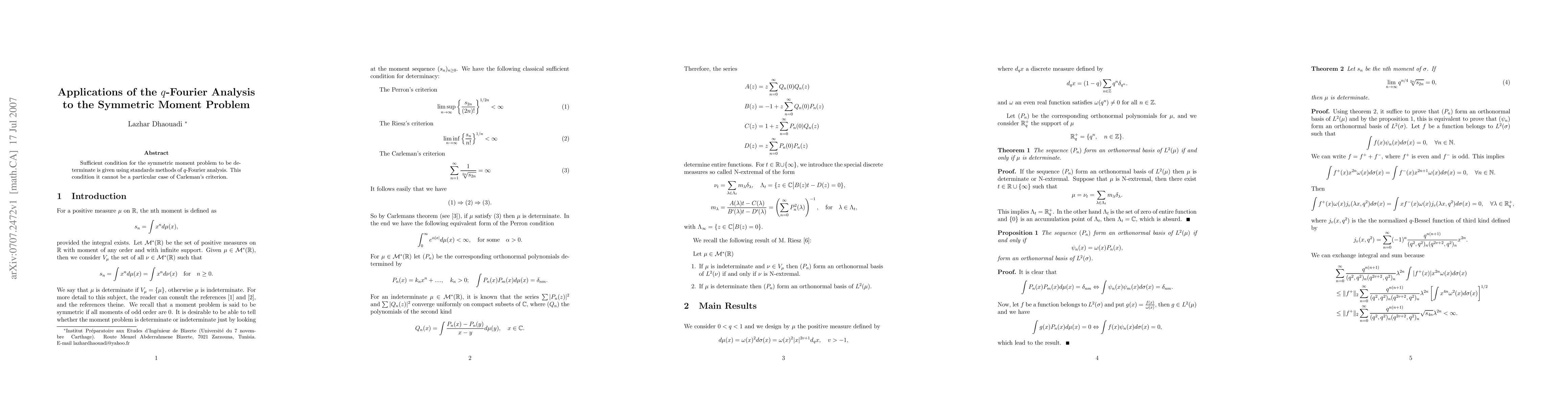 Summary: This paper presents a sufficient condition for the determinate symmetric moment problem using $q$-Fourier analysis, demonstrating that it differs from Carleman's criterion. The study highlights the unique applicability of $q$-Fourier methods in this context.