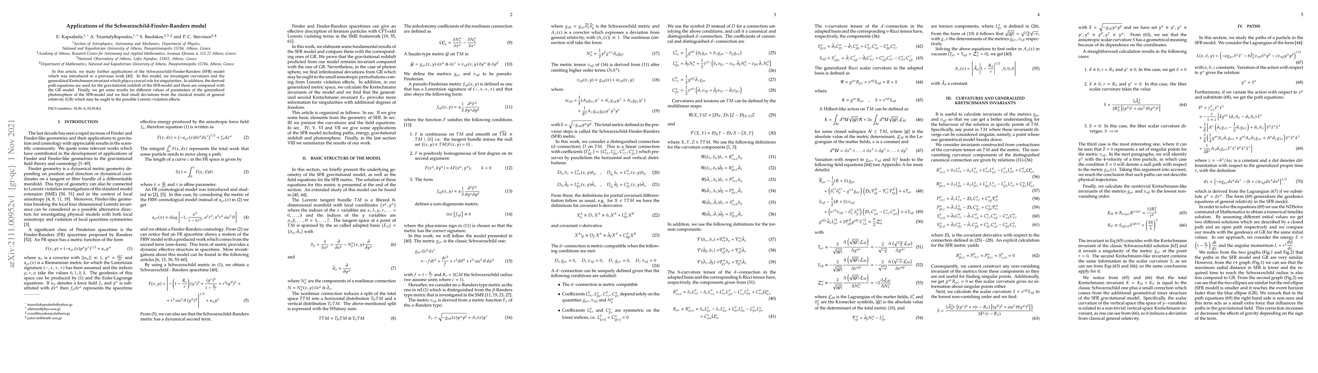 Researchers studied applications of the Schwarzschild-Finsler-Randers model, exploring curvatures, gravitational redshift, and deviations from classical general relativity results, suggesting possible Lorentz violation effects.